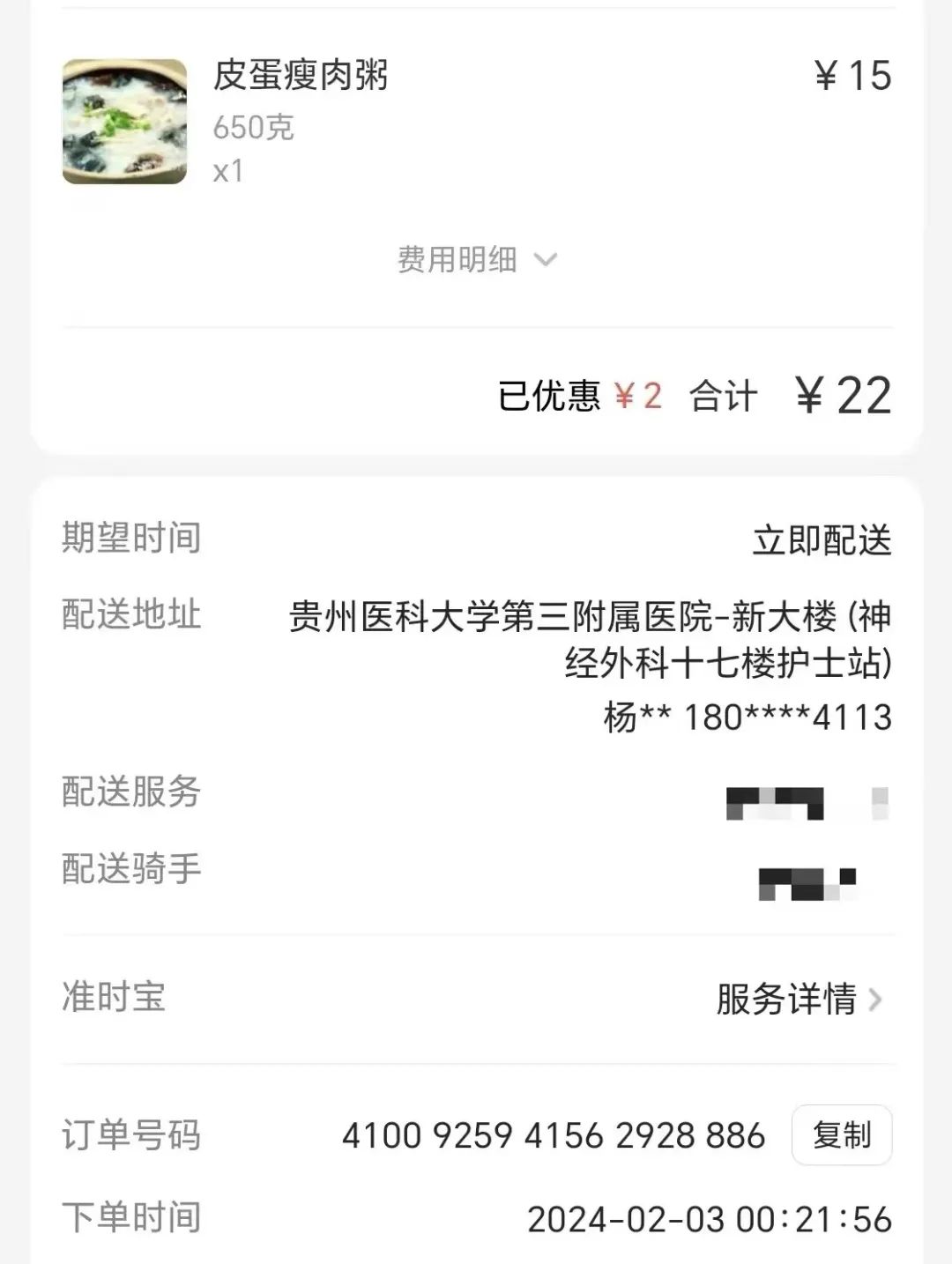 隔壁床邱叔叔看到也说饿了,杨静又热心地为他购买了一碗皮蛋瘦肉粥,并贴心喂他吃。