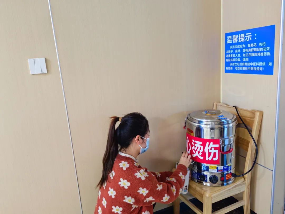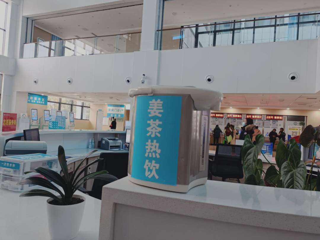门诊医护人员为前来就诊的患者倒上一杯暖暖的茶,驱走严寒。