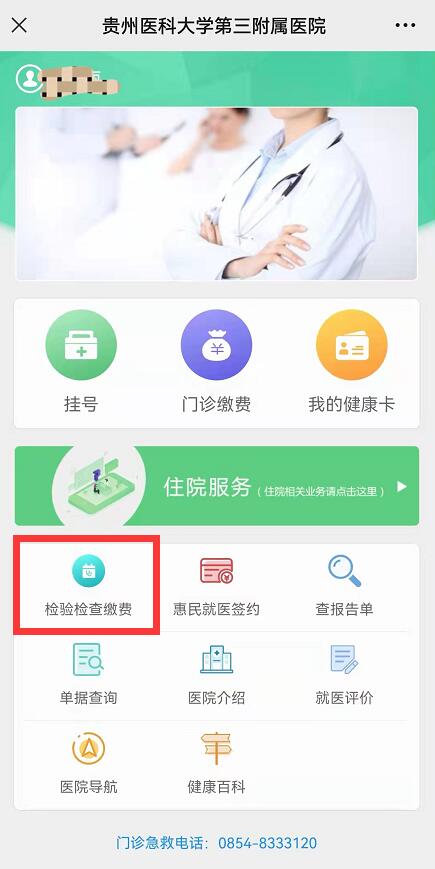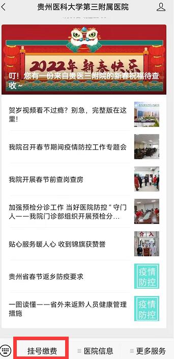 第一步:关注“贵州医科大学第三附属医院”服务号并点击“挂号缴费”;