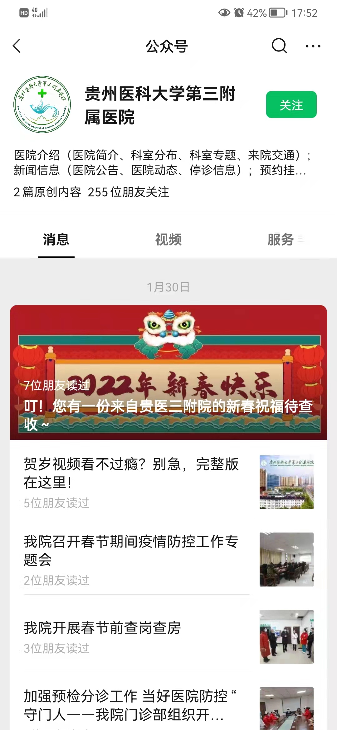 为优化就诊流程,切实方便群众就医,贵医三附院微信公众平台已实现预约挂号、缴费、获取电子票据等服务。