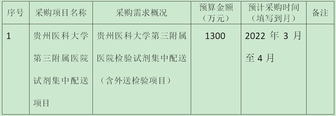 为便于供应商及时了解政府采购信息,根据《贵州省财政厅关于开展政府采购意向公开工作的通知》等有关规定,现将贵州医科大学第三附属医院 2022年3月至4月采购意向公开如下: