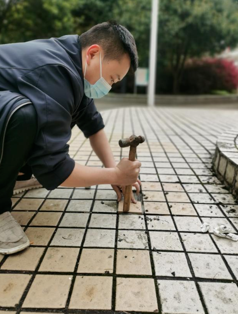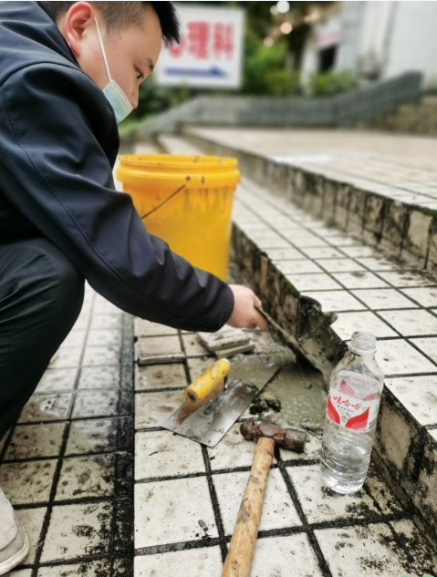 走进一看才发现是心理科下夜班的护士简斌。原来因为心理科门口地面的磁砖已经有十几处的脱落缺损,不仅影响着医院的整体美观,也给患者、家属和医务人员的出行带来安全隐患。尤其是下雨天,经常会溅到满身泥水。简斌说:“在晨会上,科室主任林德颖告诉我们,现在医院面临着很多困难,我们要在医院党委和行政的带领下力克万难,齐心协力促进科室发展,厉行节约。这点事情我们能自己克服。”