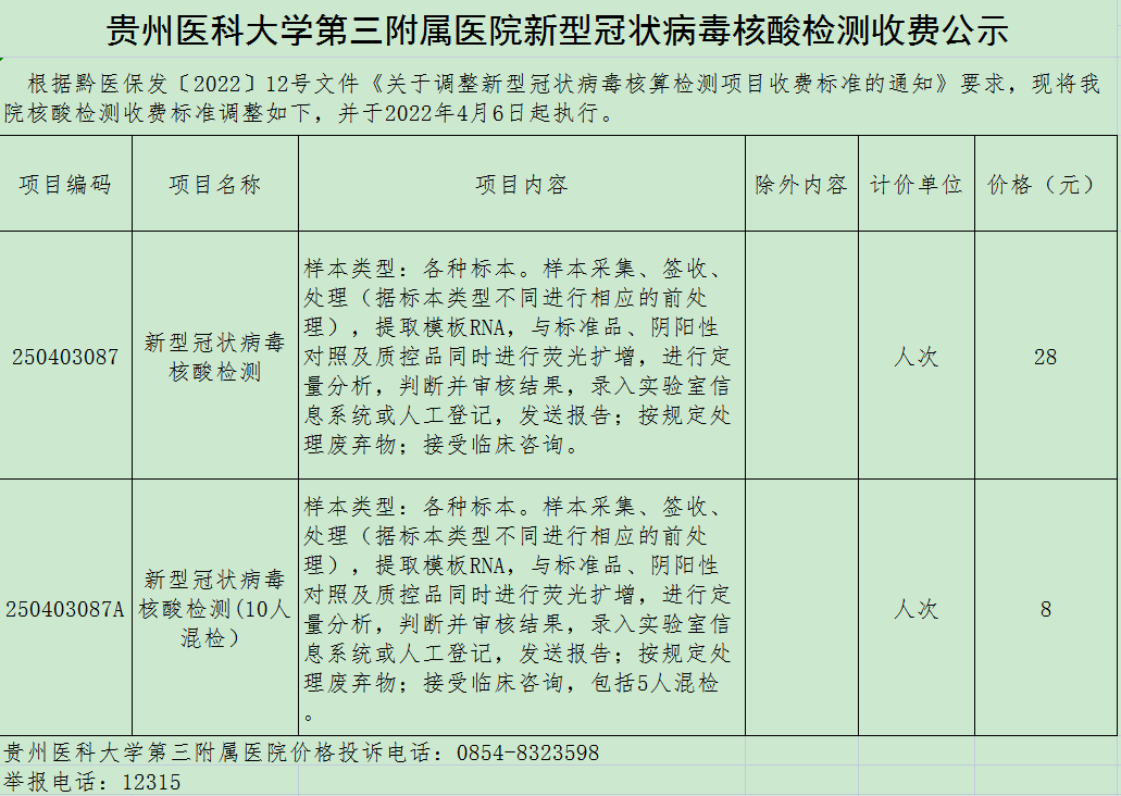 贵医大三附院新型冠状病毒核酸检测收费公示