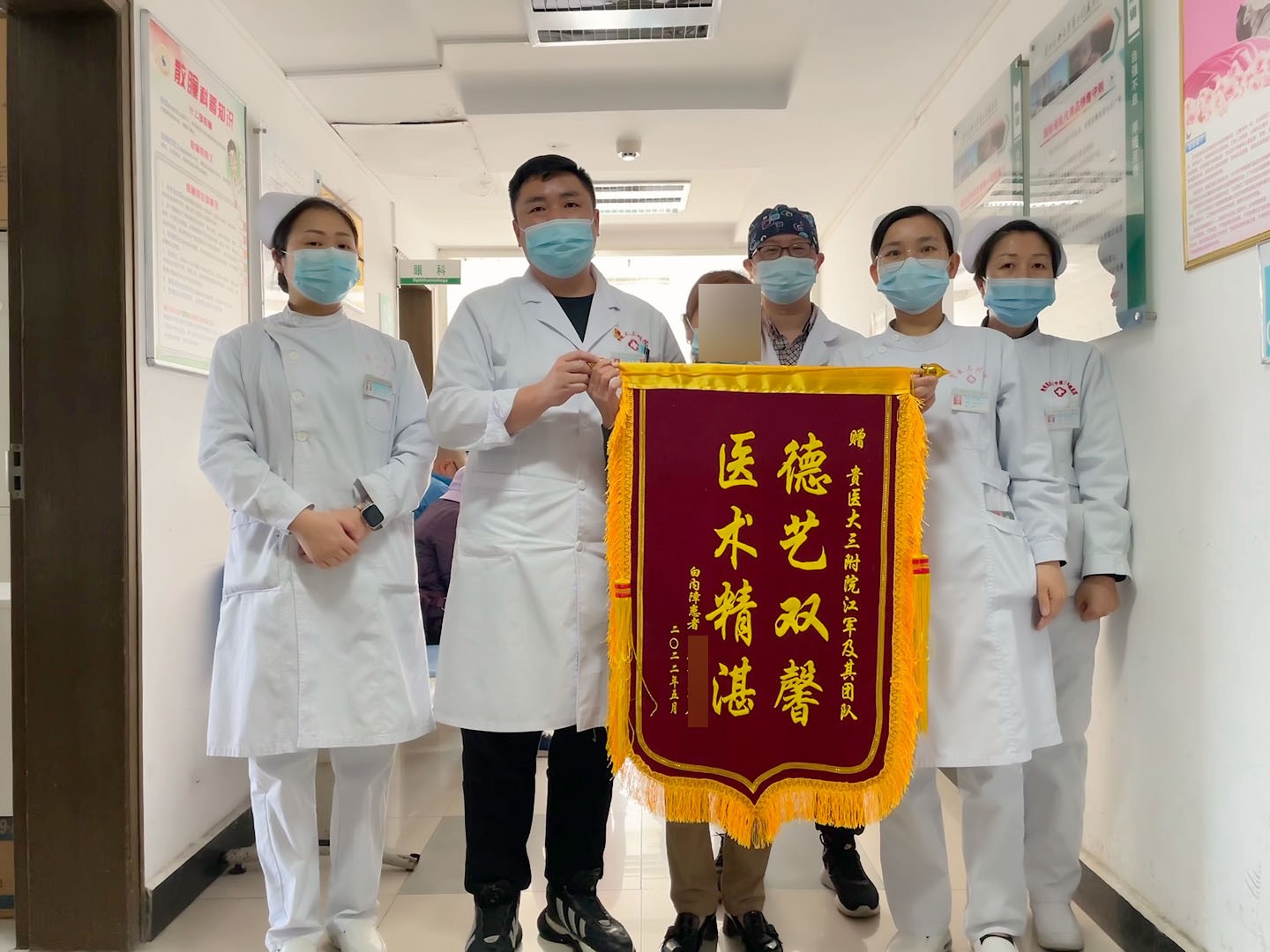 陈女士经历了两次成功的眼部白内障手术,她表示要相信医生,“民间科普”不可靠,还流下了激动的眼泪并握住江军的手再三感谢。时隔几日,为表感谢,陈女士将一面锦旗送至眼科。