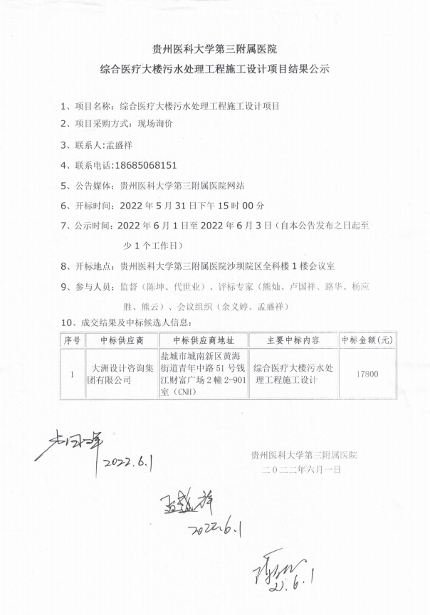 综合医疗大楼污水处理工程施工设计项目结果公示