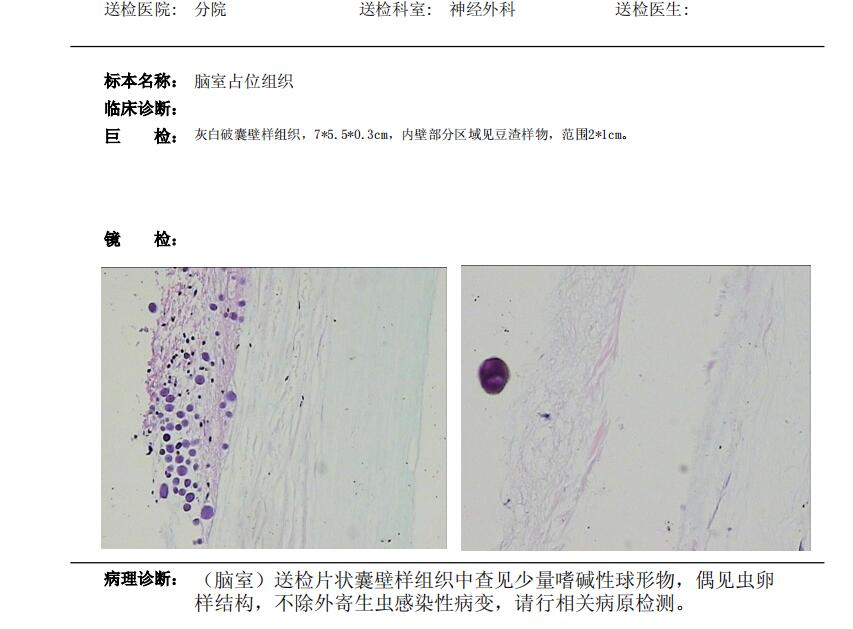 在麻醉科手术室的密切配合下,手术顺利实施。因囊肿巨大,手术中通过切开囊壁吸出囊液后,分块切除囊壁,最终完整取出脑室内囊性物,大小约7x5.5X0.3cm。经病理检查偶见虫卵样结构。原来,洛叔叔平时喜欢吃凉拌猪血,结合病理检查判断为脑囊虫。