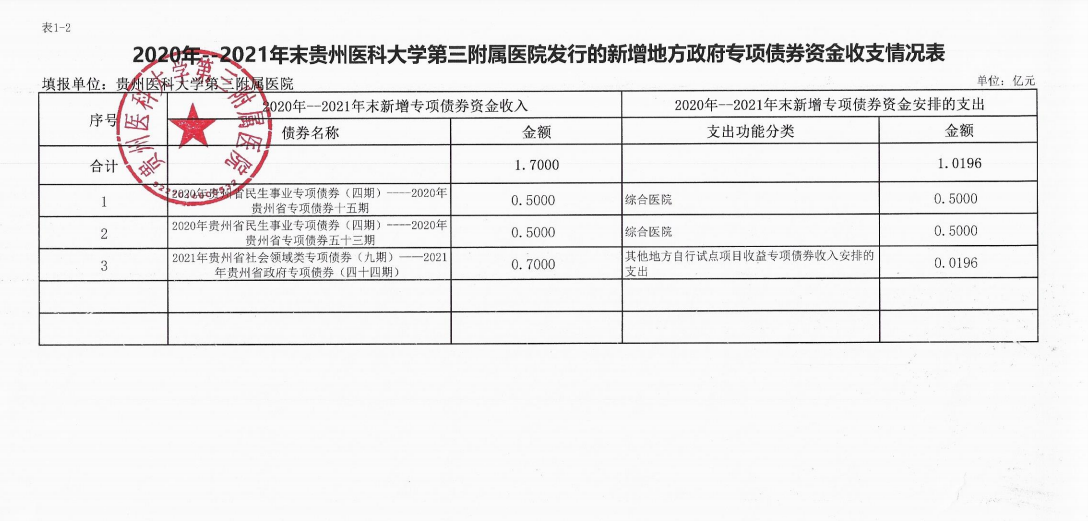 2020年——2021年末贵州医科大学第三附属医院发行的新增地方政府专项债券资金收支情况表