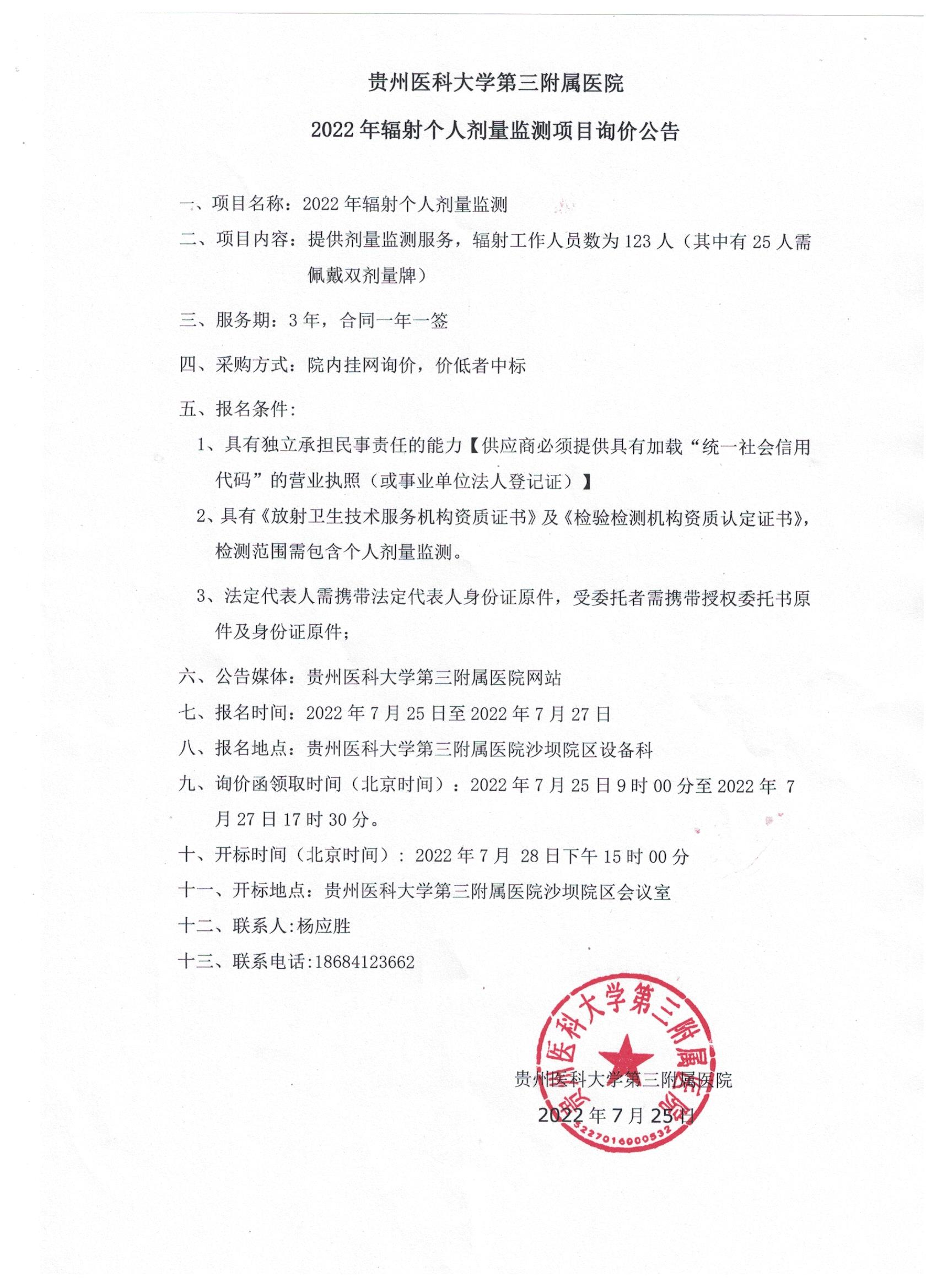 贵州医科大学第三附属医院 2022年辐射个人剂量监测项目询价公告