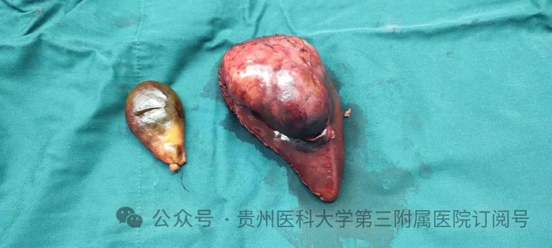 术中切除的胆囊(左)、巨大肝脏肿瘤(右)