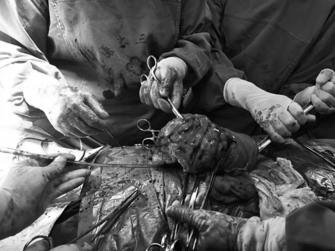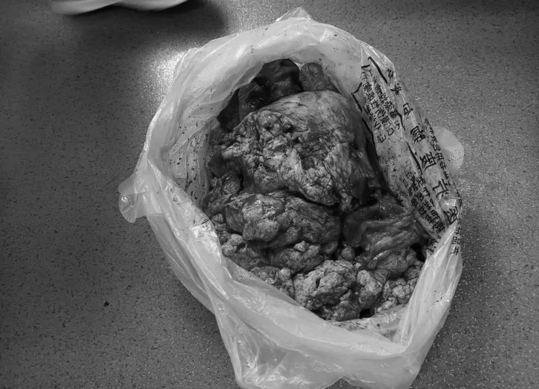 妇科主任李远珺带领团队为李阿姨制定了详细的手术方案,拟行子宫全切术+双侧输卵管切除术。术中发现包块填满整个盆腹腔,并与肠管、网膜、盆侧壁粘连致密。术中冰冻病理切片诊断:子宫肌瘤。因包块与肠管粘连致密,妇科联合胃肠外科协同作战,手术历经4个小时,成功将20cm×18cm×16cm的肌瘤取出。肌瘤约有一个4号足球大小,约有10斤重,手术顺利。现李阿姨已康复出院。