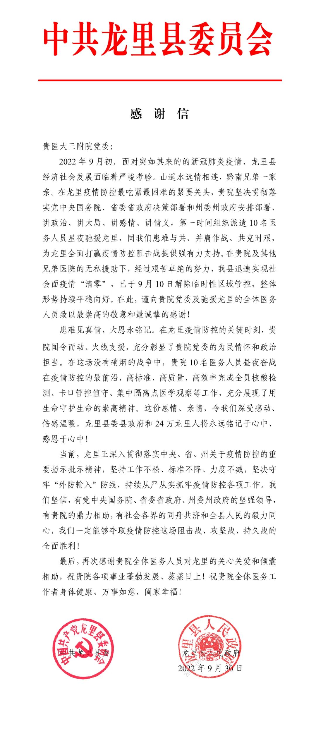来自龙里县委、县政府的感谢信:充满感激与祝福
