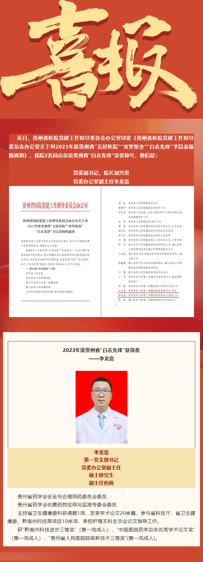 李龙宽2021年7月回到医院工作。目前,任第一党支部书记、党委办公室副主任。李龙宽一直关心乡村振兴发展,10余次组织专家到乡村振兴帮扶点——三穗县开展健康义诊活动。同时积极开展结对共建活动,先后组织医院党员、干部职工,到荔波县、独山县、匀东镇、墨冲镇、贵坪村等地开展党建共建及义诊送健康活动10余次,服务群众1000余人次。