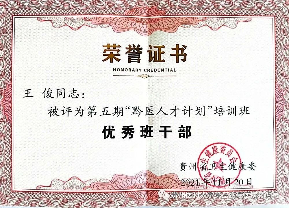 由于表现优秀,王俊被贵州省卫生健康委评为第五期“黔医人才计划”培训班优秀班干部。