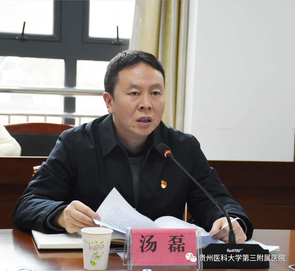 汤磊首先对我院全面从严治党主体责任落实情况、医院发展、医教研协同、运营管理、学科建设、人才培养、医疗质量、社会服务等方面取得的成绩给予了肯定。汤磊强调,一是全面落实党建引领高质量发展。要找到抓好基层党建工作的新举措、新方法,“选”优“配”强党支部书记,配强支部班子,发挥支部在加强党的建设,推动医疗卫生、学科建设、科学研究、临床教学、精细化管理等中的作用。二是全面形成人才兴院总发展方略。要围绕人才引进、人才培育、人才评价、人才服务等方面,加强人才工作整体规划;要进一步完善人才分类评价和激励机制,充分发挥人才价值和人才效能。三是全面建立医教研融合发展态势。要有大局意识,找准定位,理清思路,把握机遇,把医院的发展自觉融入到贯彻落实党的二十大和省第十三次党代会精神中,加快双师型教师的培育,加强临床教学管理,坚持创新驱动发展,精心培育重点核心技术,打造区域优势学科,积极探索出一条有亮点、有特色,具有引领示范作用的医教融合、协同发展道路,共同培养高质量的医学人才。四是全面营造风清气正的政治生态。要深刻认识全面从严治党的重大意义,党委要坚决履行主体责任,书记要切实担负起第一责任人责任,班子成员要认真履行“一岗双责”,纪委要履行监督责任,要促进医院严格落实中央八项规定精神、完善反腐倡廉制度规范,构建系统化防治腐败工作制度体系。
