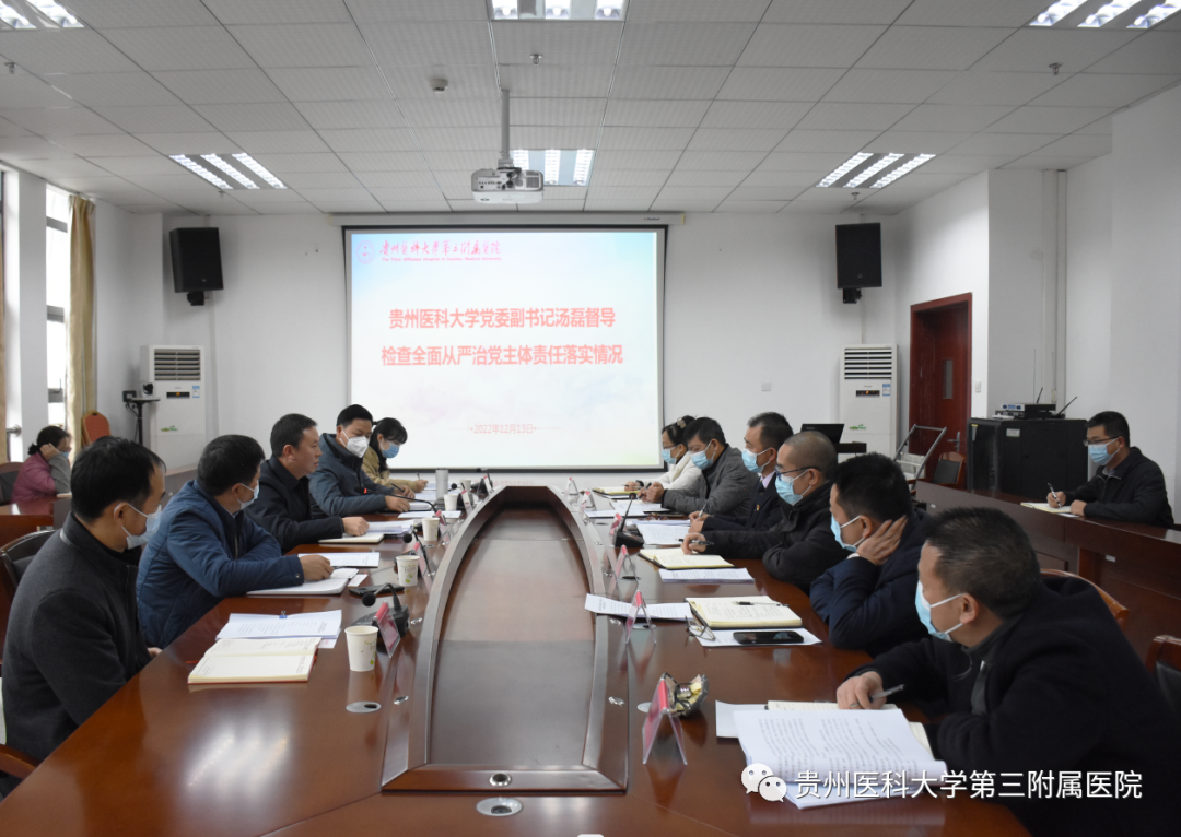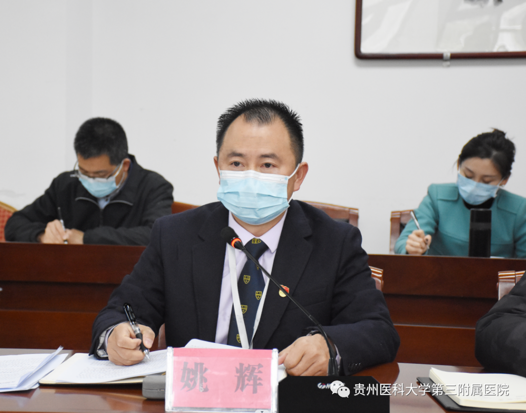姚辉就我院2022年度落实全面从严治党工作情况进行了汇报。他表示,三附院党委将认真贯彻落实党的二十大精神和省第十三次党代会精神,认真履行全面从严治党主体责任,进一步提高一体推进不敢腐、不能腐、不想腐的能力和水平,以高质量党建引领医院高质量发展,为建设健康贵州、健康黔南作出新的积极的贡献。