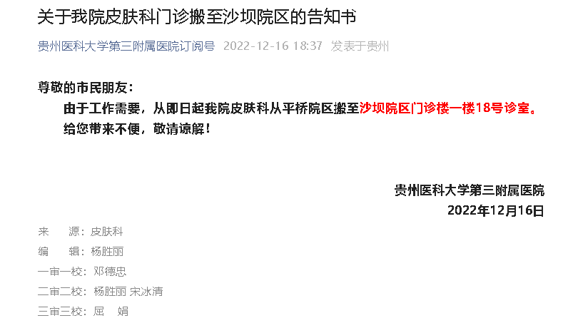 关于我院皮肤科门诊搬至沙坝院区的告知书