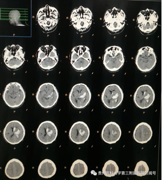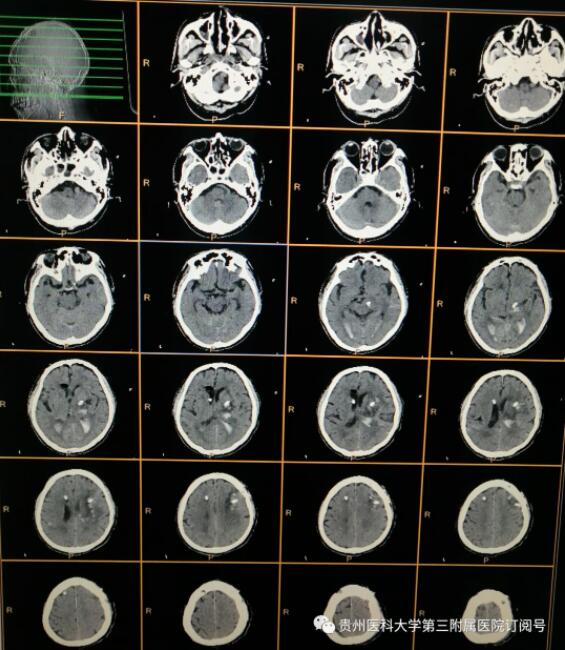 术后第七天,患者意识逐渐好转,左侧肢体可自主活动,能配合医师完成相关动作,右侧肢体在刺痛状态下可水平移动。目前患者仍在神经外科康复治疗中。