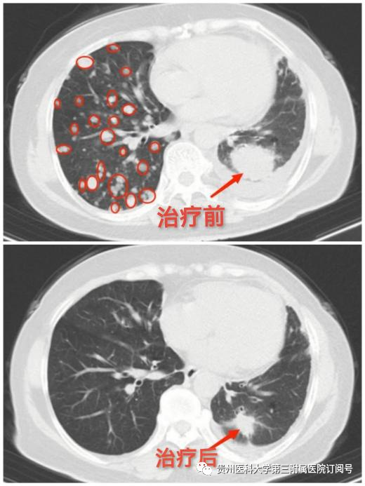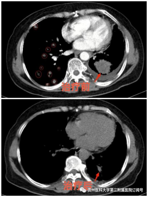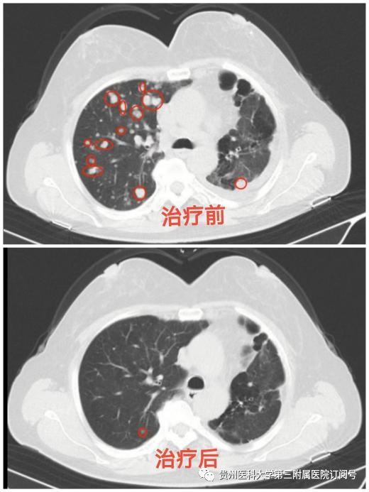 功夫不负有心人,经过肿瘤科的精心治疗和悉心护理,黄女士咳嗽、咳痰、胸痛、胸闷及呼吸困难已基本缓解,复查胸部CT提示多处病灶均较前明显缩小,精神状态明显好转。
