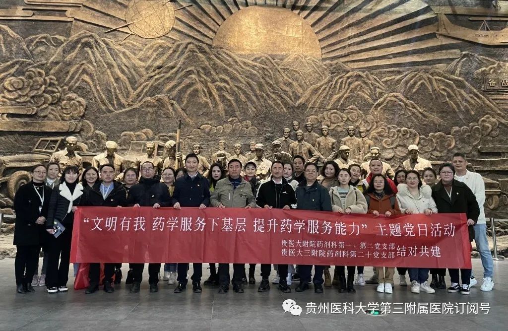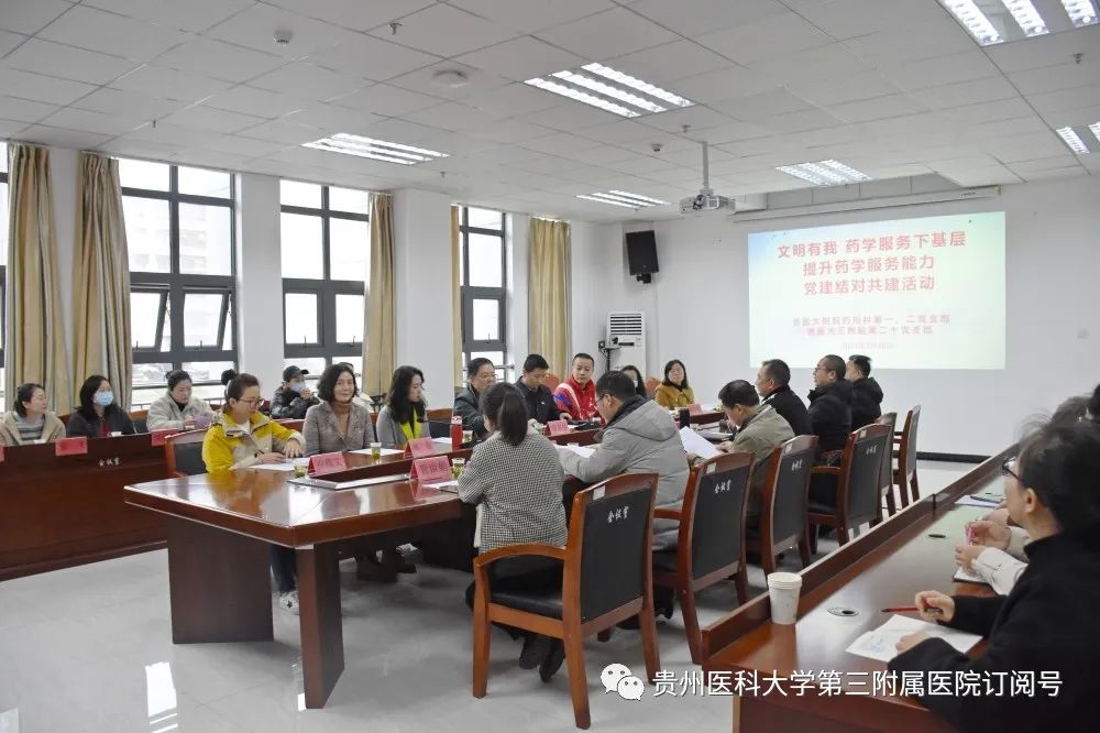 3月28日,贵州医科大学附属医院第一党支部书记、药剂科主任郑志昌,第二党支部书记、药剂科副主任李明一行到我院与第二十党支部开展结对共建暨“文明有我、药学服务下基层、提升药学服务能力”主题党日活动。我院党委书记姚辉,党委副书记、院长刘兴贵,党委副书记杨胜华,相关职能部门负责人、第二十党支部全体党员参加。