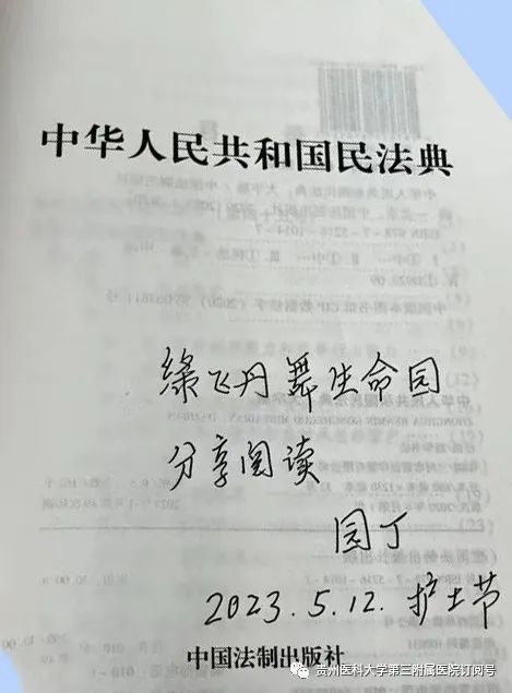 近日,我院神经内科收到一份特殊的礼物:患者高奶奶(化名)及其家属送来的写有“医术精湛精心护理 医德高尚情暖人心”的锦旗和一本写着“缘飞丹舞生命园 分享阅读”的《中华人民共和国民法典》。