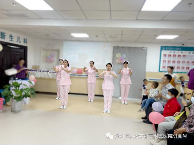 新生儿科护理团队为小朋友们表演手势舞《你笑起来真好看》。
