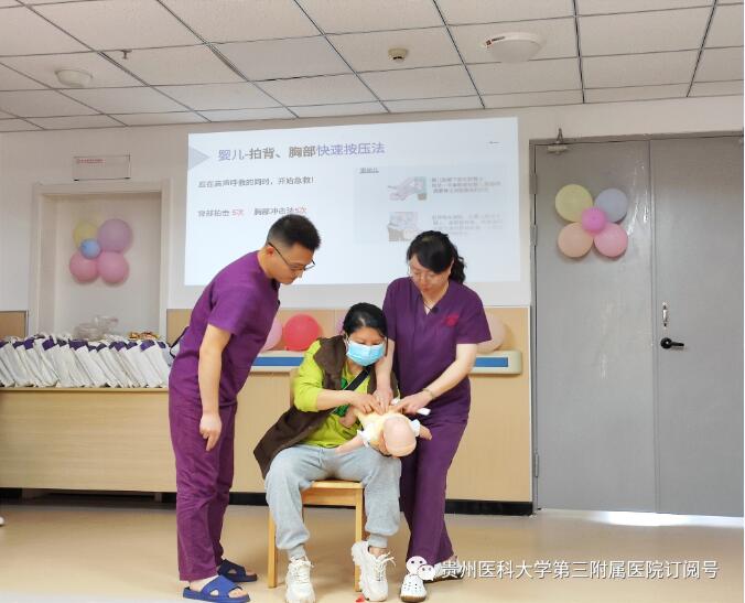 李文华演示海姆立克急救法,指导家长在紧急情况下如何给宝宝急救,家长们积极参与实操。
