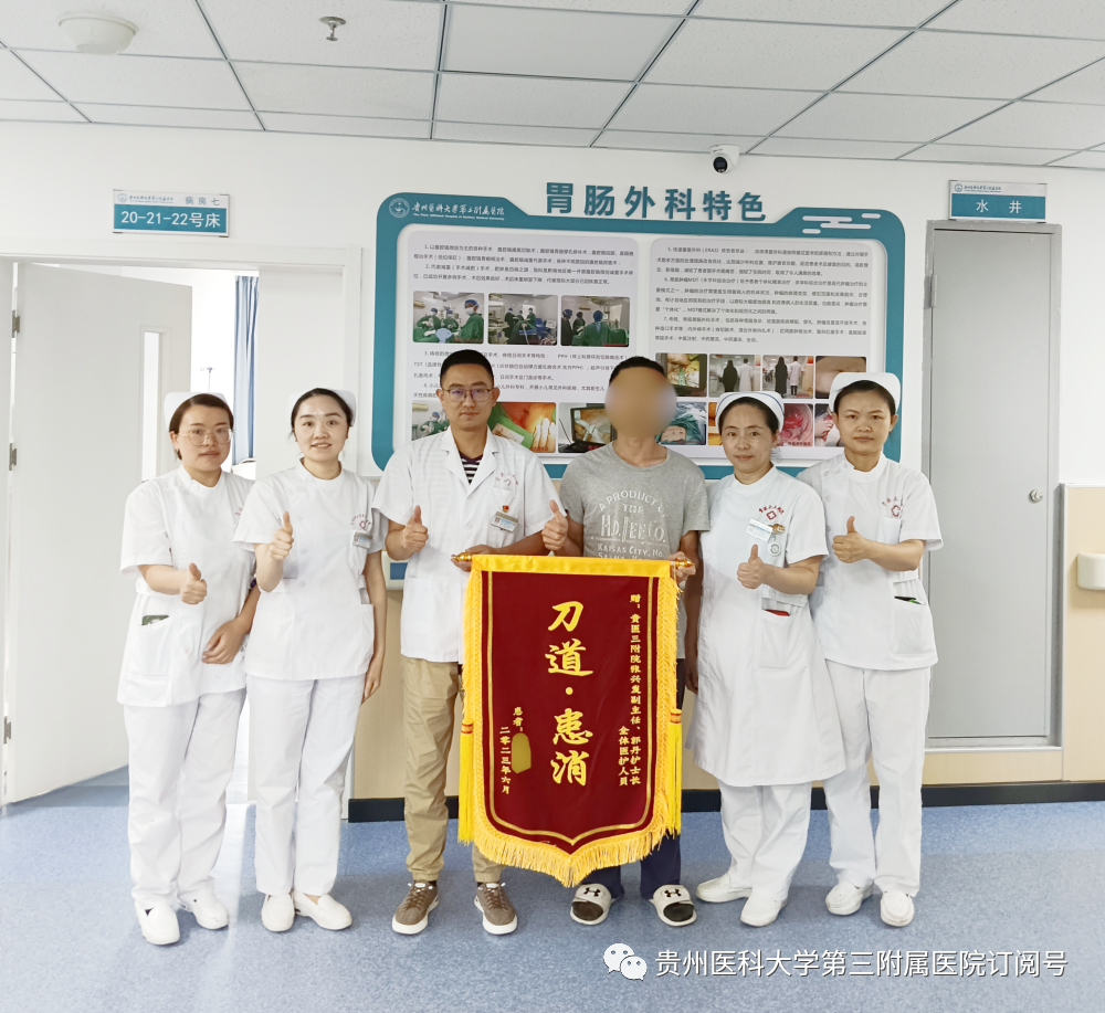 近日,我院胃肠外科收到患者夏先生送来的锦旗,感谢科室全体医护人员给予的精心治疗和无微不至的关心。42岁的夏先生因“肛门肿物反复脱出20年,加重两周”入院。入院后科室副主任、主任医师吴忠亮,副主任、副主任医师张兴发组织科室团队为其制定个性化的诊疗方案,并为夏先生成功行“吻合器痣上黏膜环切述(PPH)”。