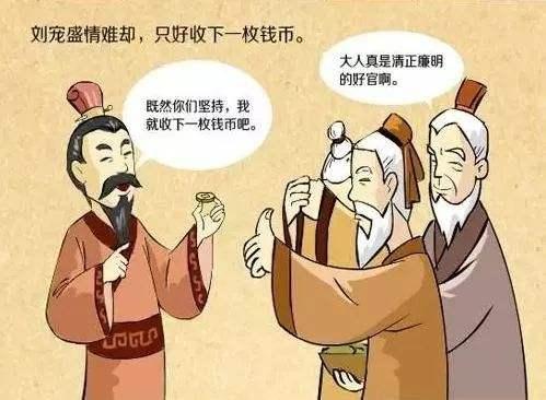 东汉刘宠任会稽太守时,改革弊政,废除苛捐杂税,政绩卓著,为官十分清廉。后来被朝廷调任为大匠之职。在他离任时,当地百姓主动凑钱来送给刘宠,刘宠不收。百姓流着泪对刘宠说:“以前那些太守动不动就派官吏到民间索取钱财,不分白天黑夜,弄得鸡飞狗叫,使百姓不得安宁。但自从您上任以来,我们老百姓终于能睡个安稳觉了。我们听说您要走,大家想来送送您,乡亲们凑了些钱给您作路费,聊表心意。”虽然刘宠万般推辞,但终是盛情难却。于是,他只好从他们手中各拿了一枚铜钱。
