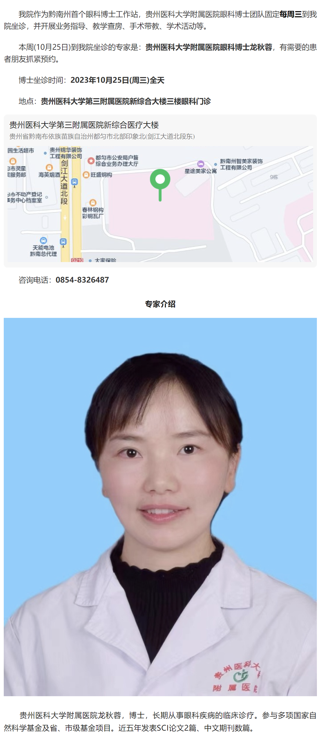 【贵医专家在都匀】10月25日眼科龙秋蓉博士来我院坐诊!速约~