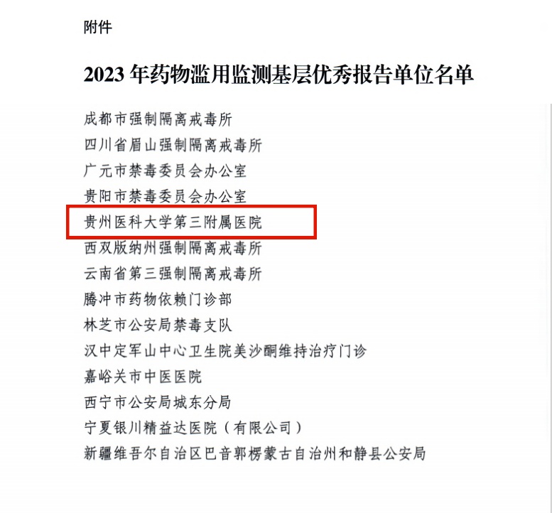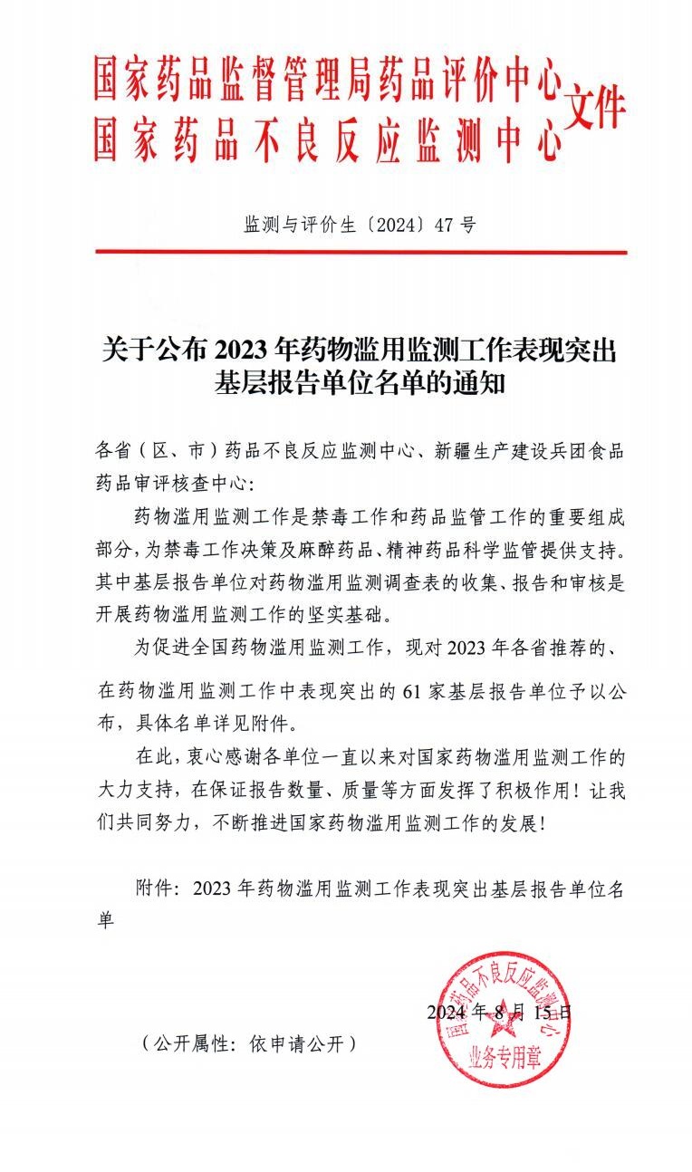 我院获“2023年药物滥用监测工作表现突出基层报告单位”,是这次名单中全国唯一家综合性医院,也是贵州省首家获得的医疗机构。近日,国家药品监督管理局药品评价中心、国家药品不良反应监测中心印发了《关于公布2023年药物滥用监测工作表现突出基层报告单位名单的通知》(〔2024〕47号),公布了全国药物滥用监测工作表现突出的61家基层报告单位名单。我院名列其中。