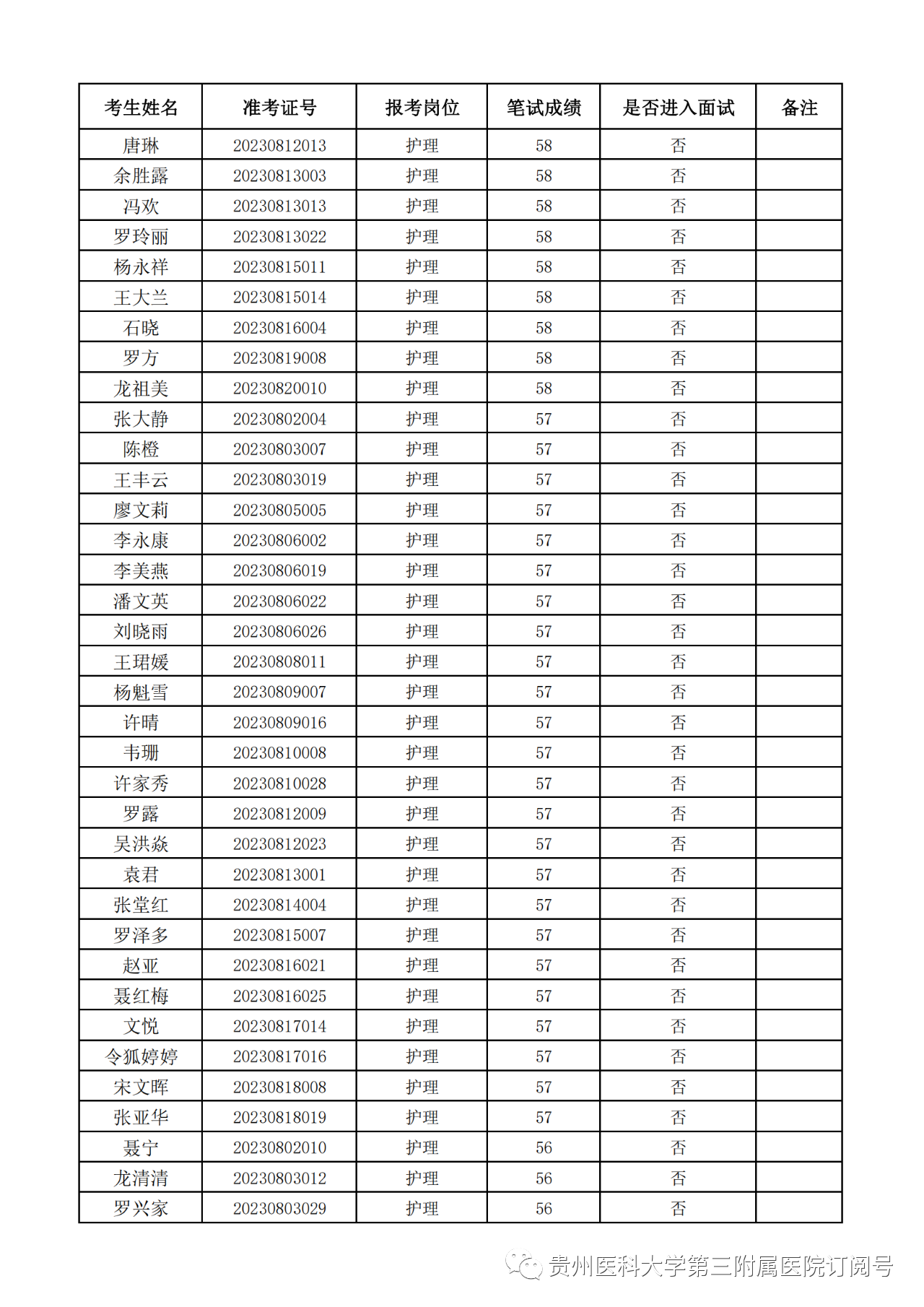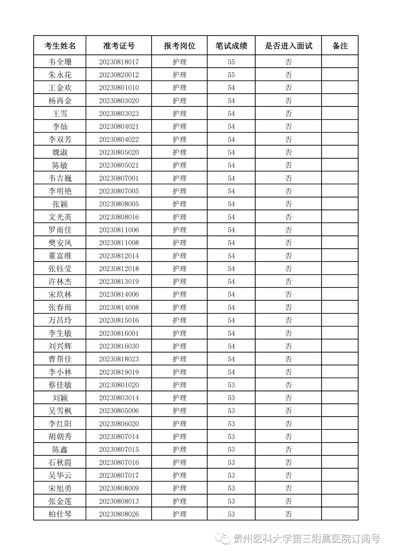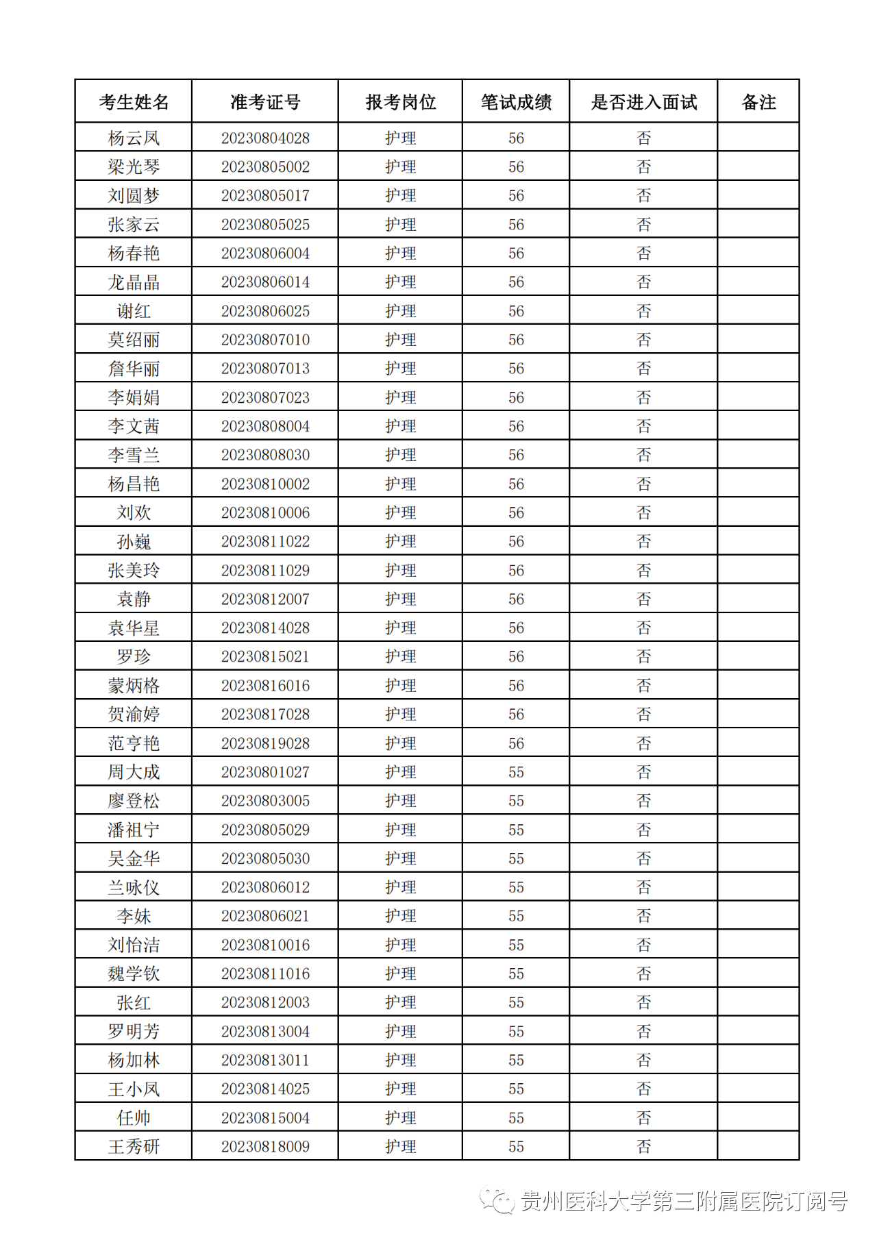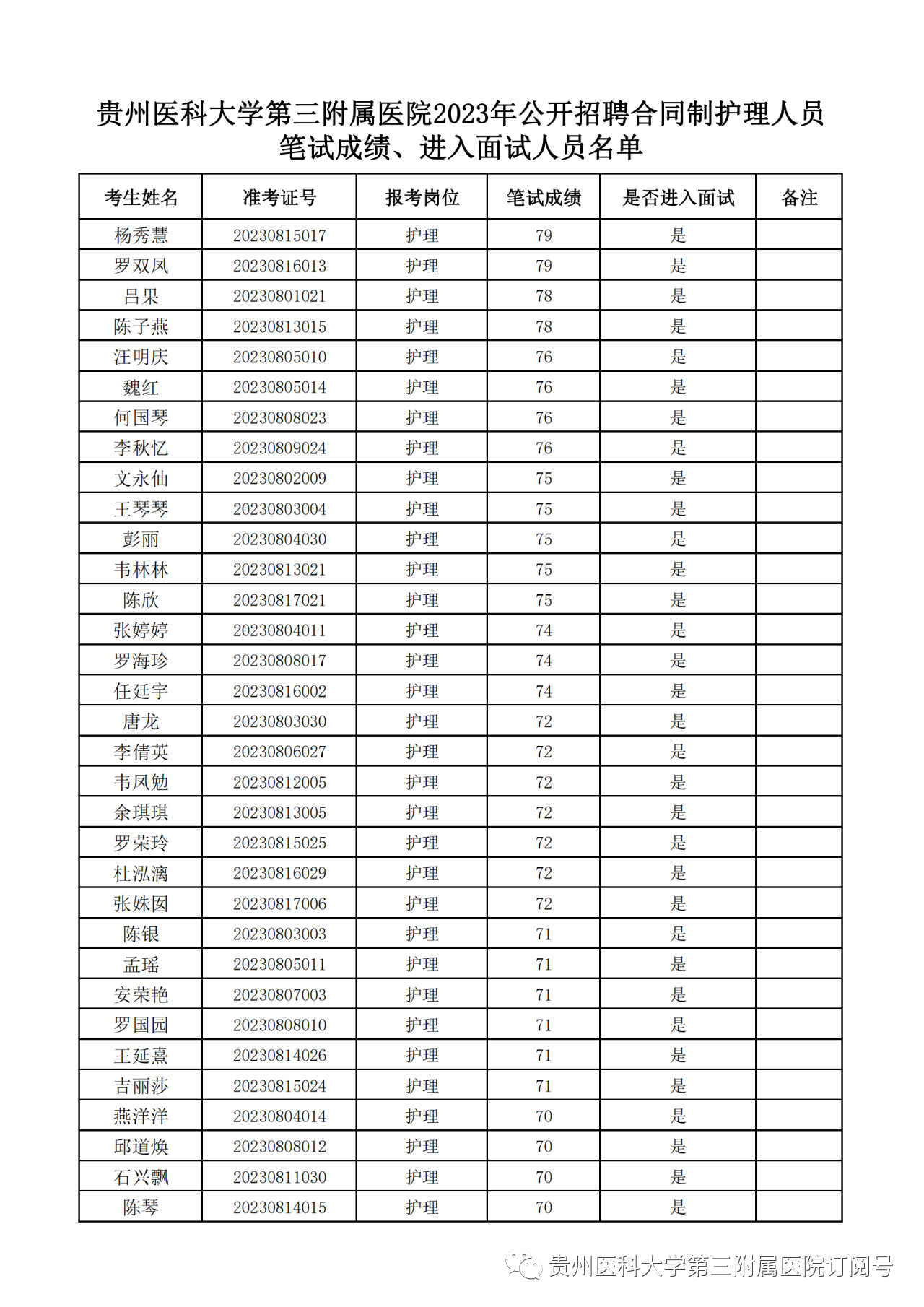 贵州医科大学第三附属医院关于发布2023年公开招聘合同制护理人员笔试成绩、进入 面试人员名单公示及面试安排通知