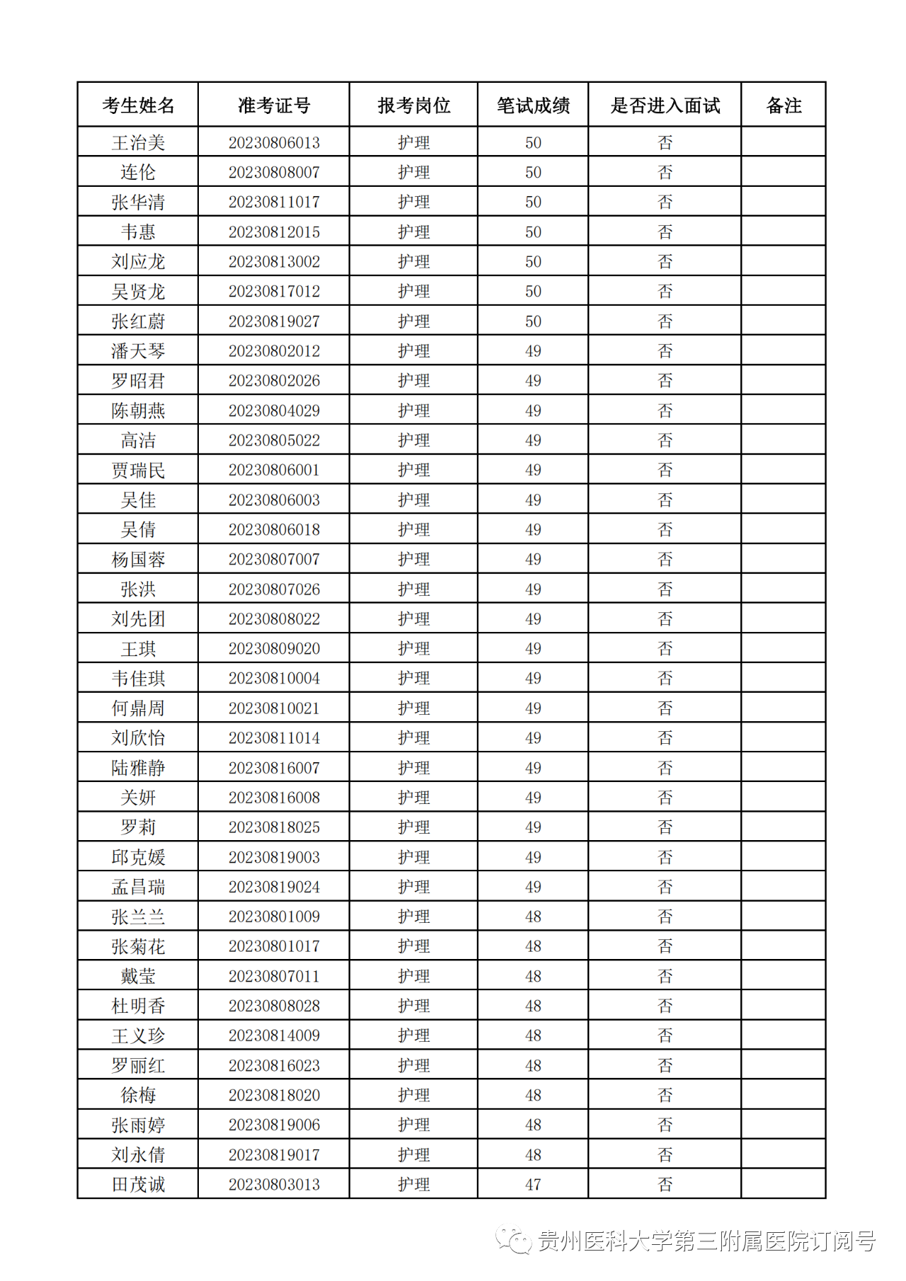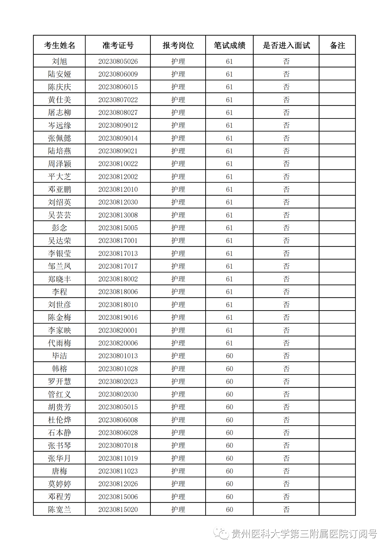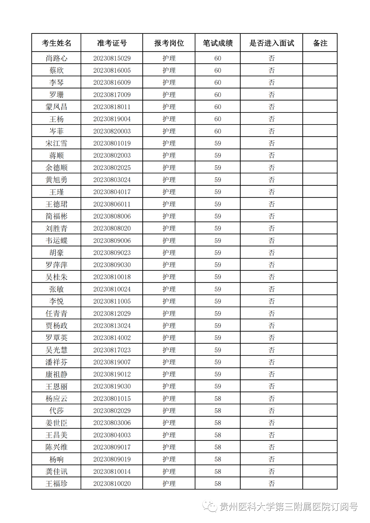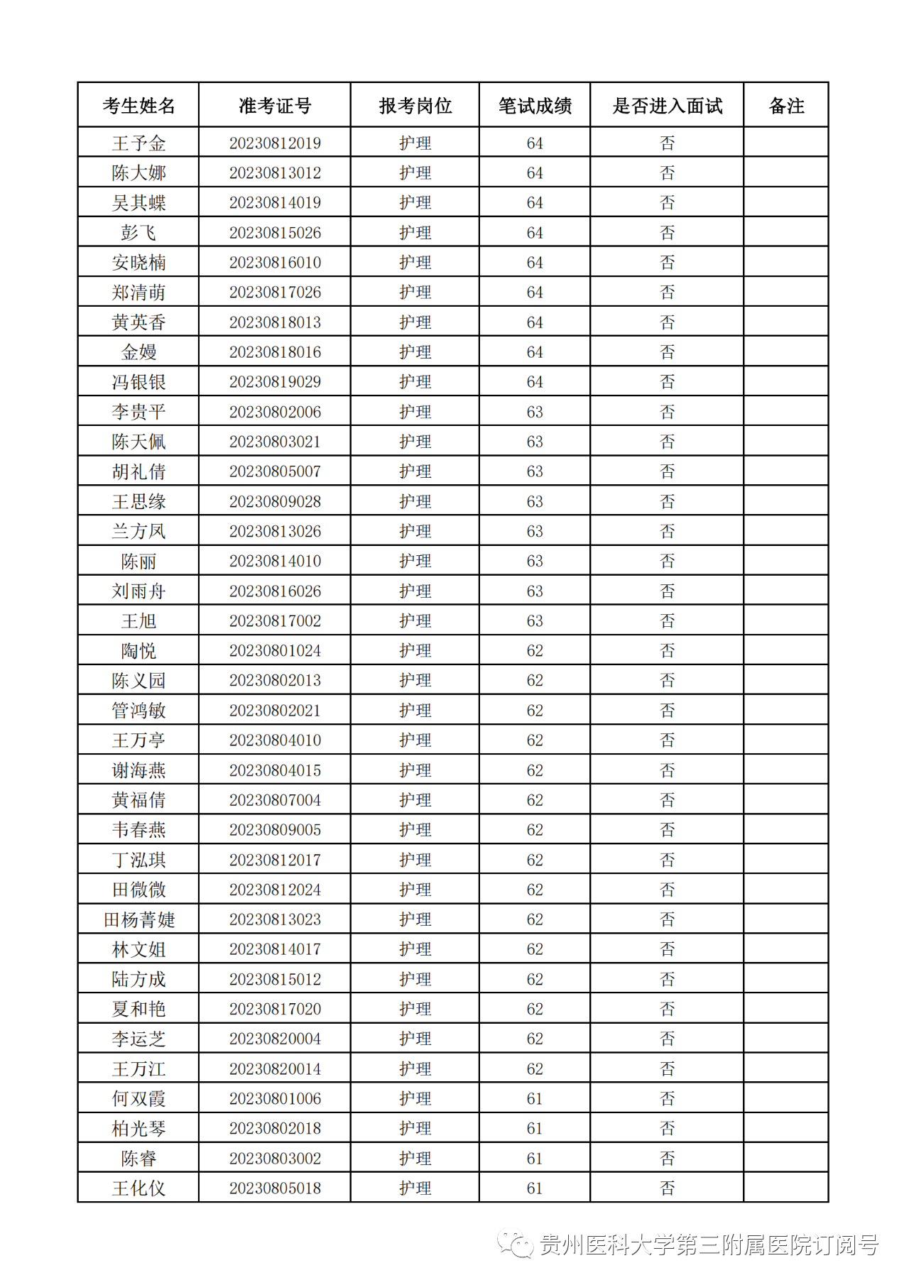 贵州医科大学第三附属医院关于发布2023年公开招聘合同制护理人员笔试成绩、进入 面试人员名单公示及面试安排通知