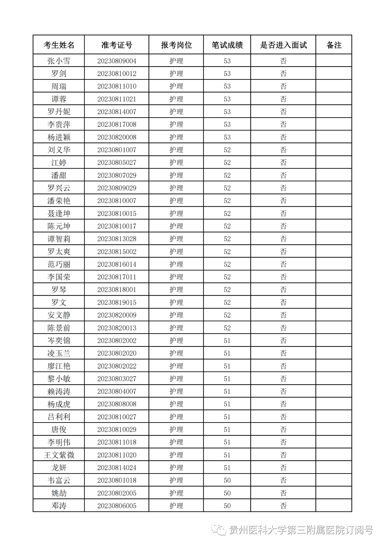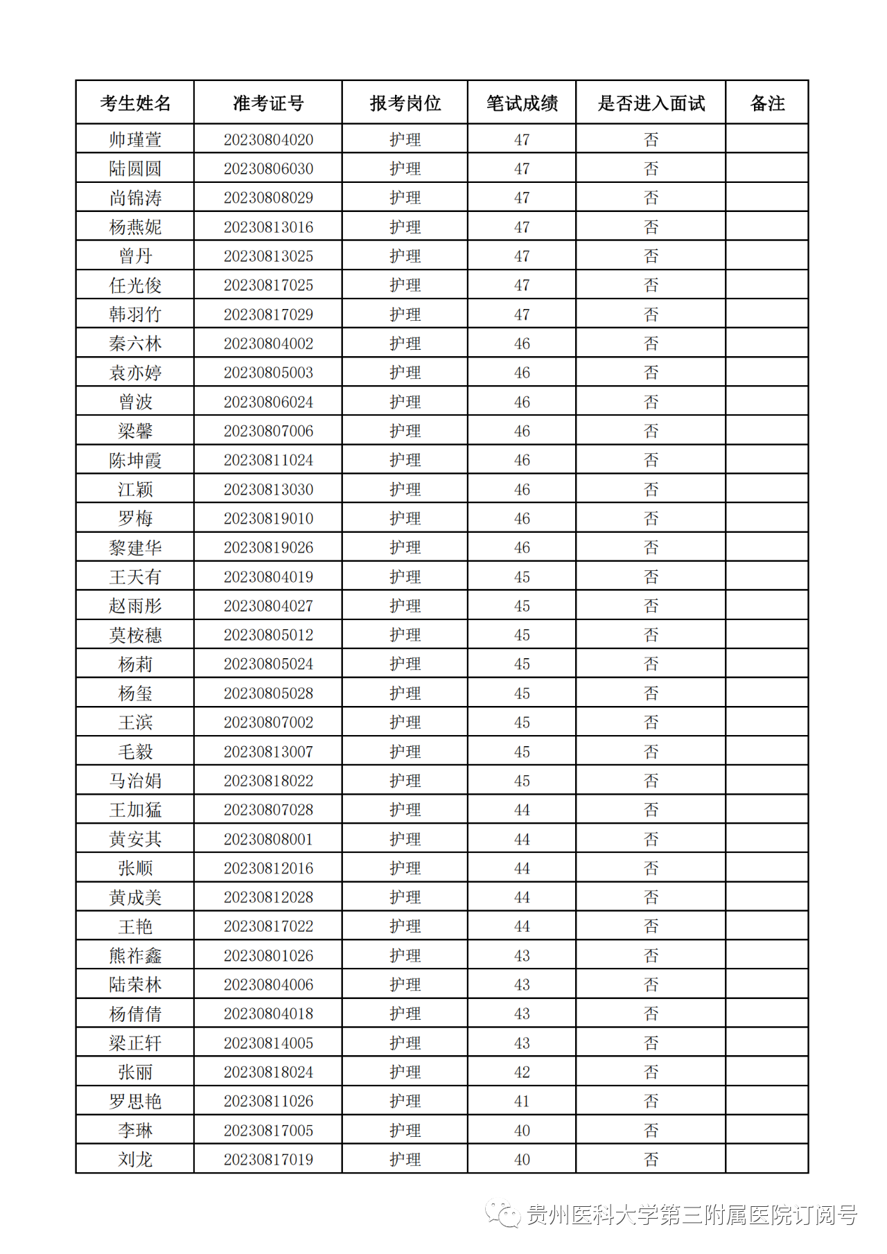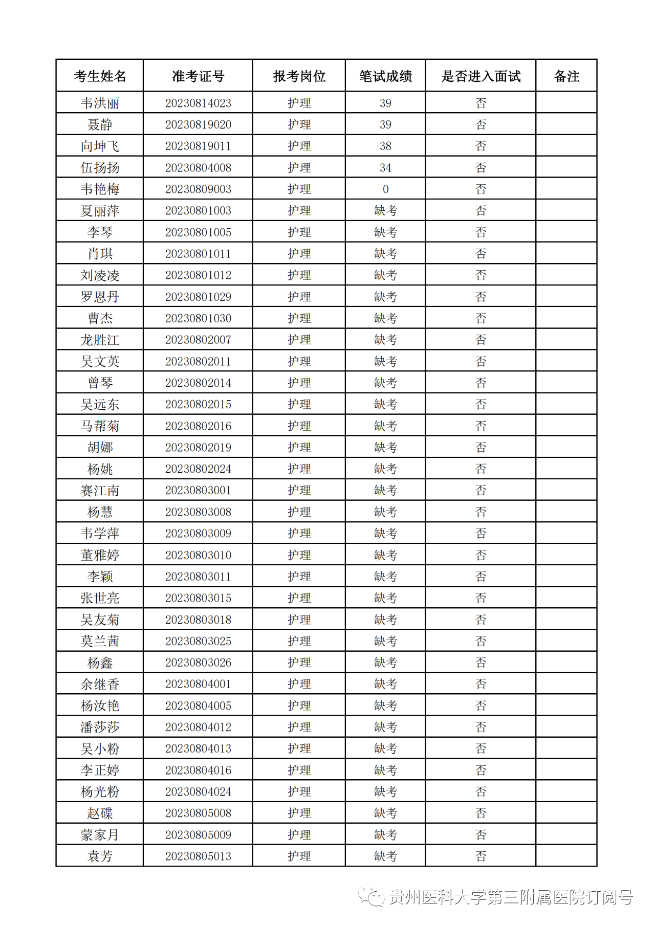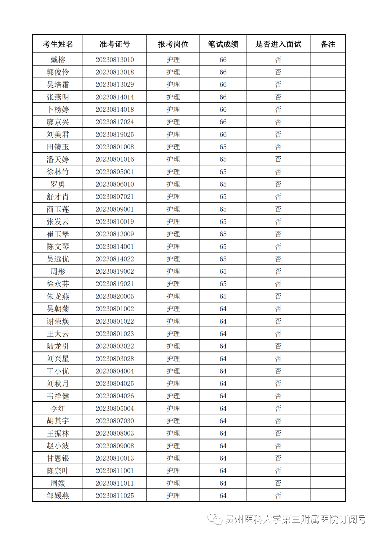 贵州医科大学第三附属医院关于发布2023年公开招聘合同制护理人员笔试成绩、进入 面试人员名单公示及面试安排通知