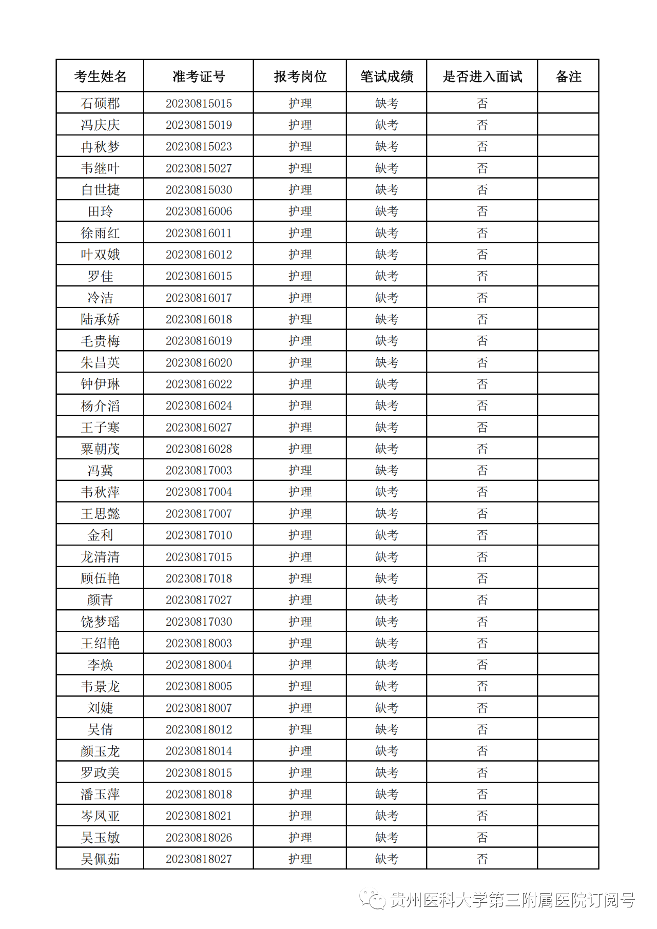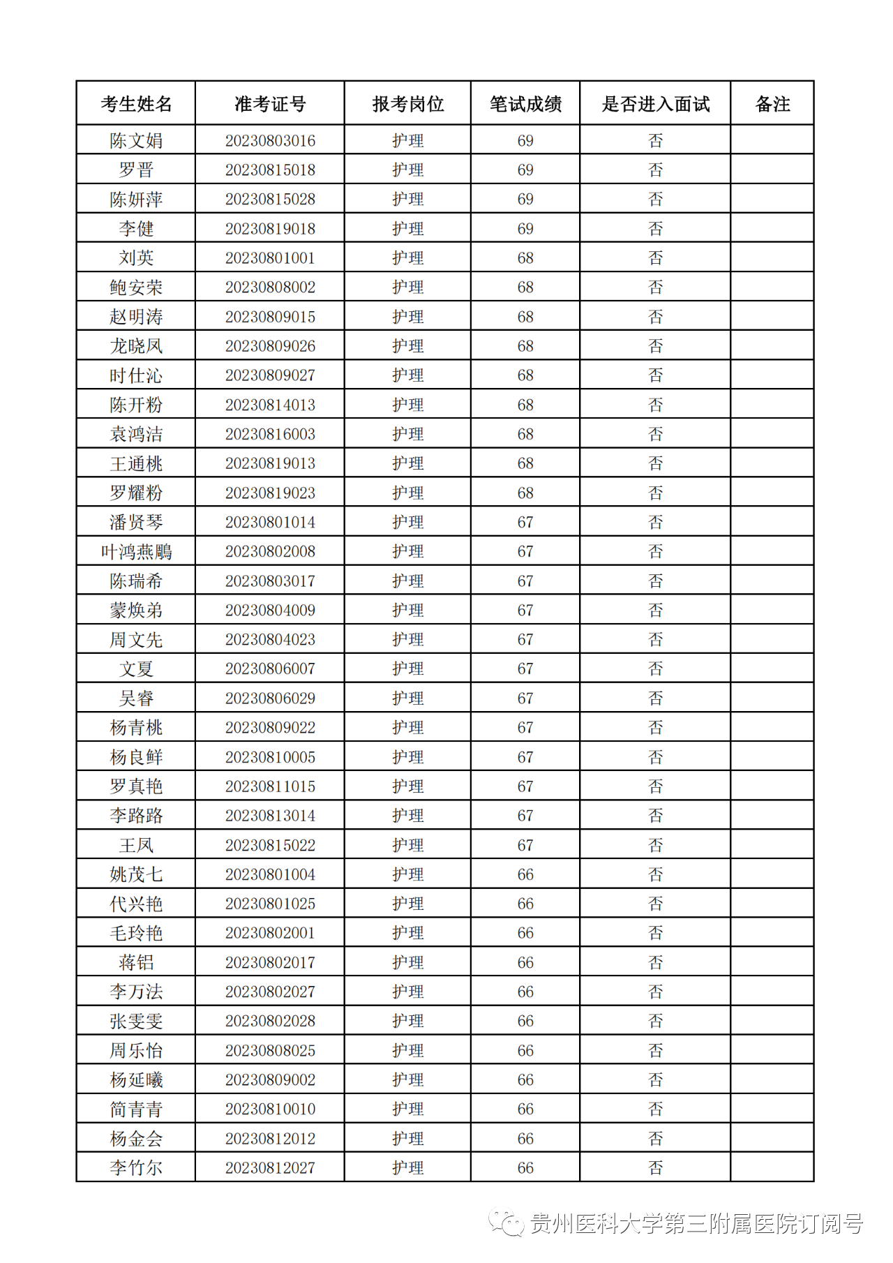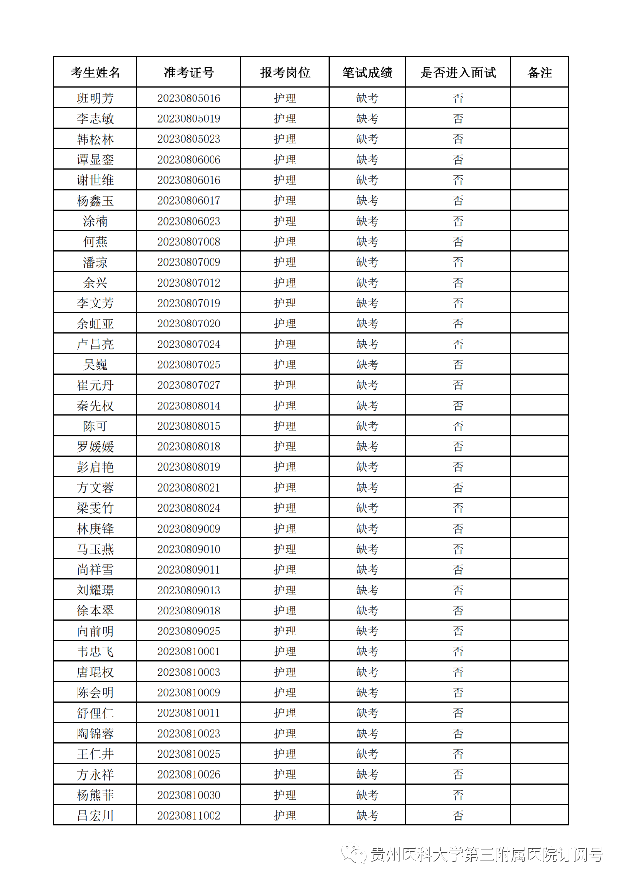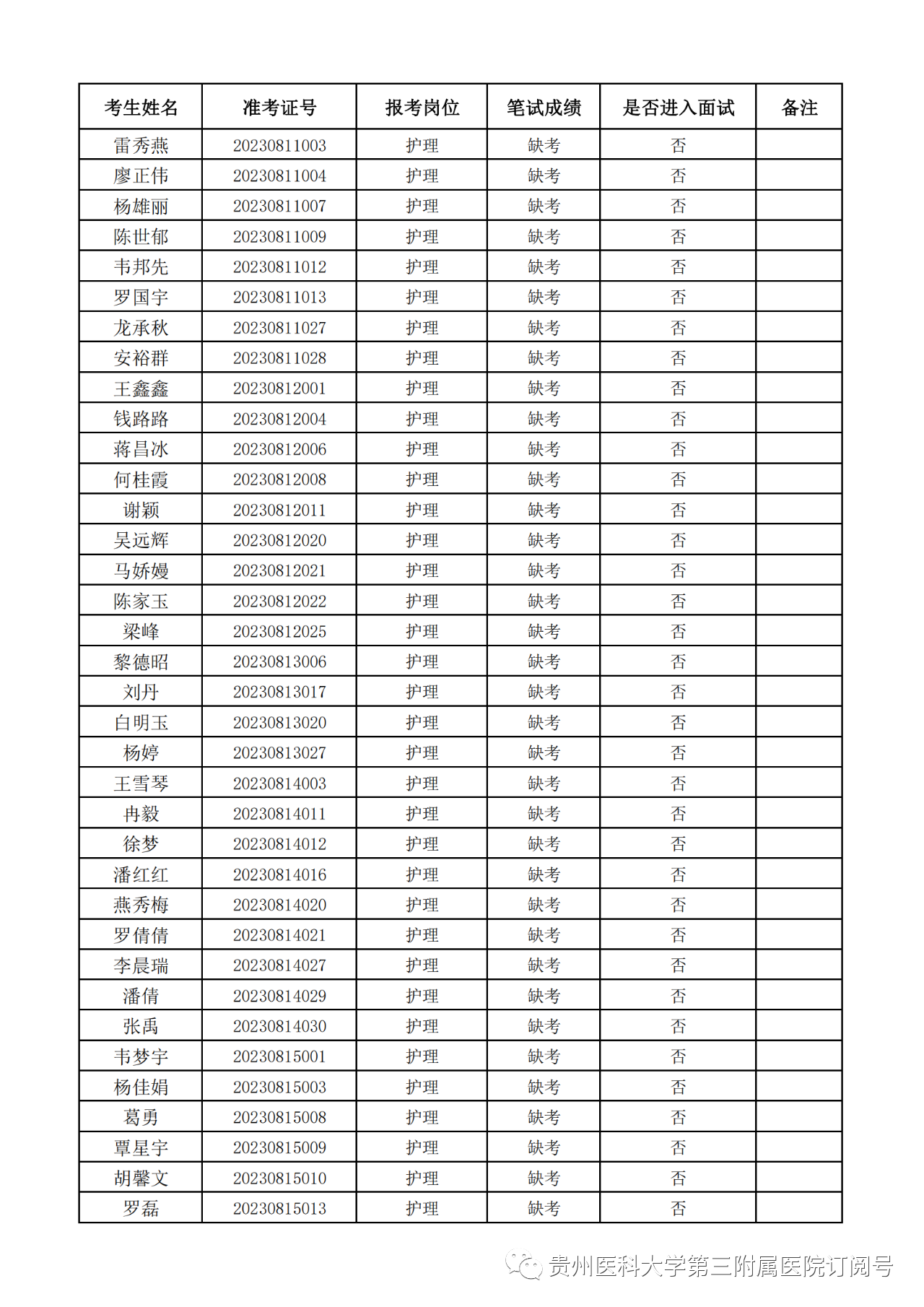 贵州医科大学第三附属医院关于发布2023年公开招聘合同制护理人员笔试成绩、进入 面试人员名单公示及面试安排通知