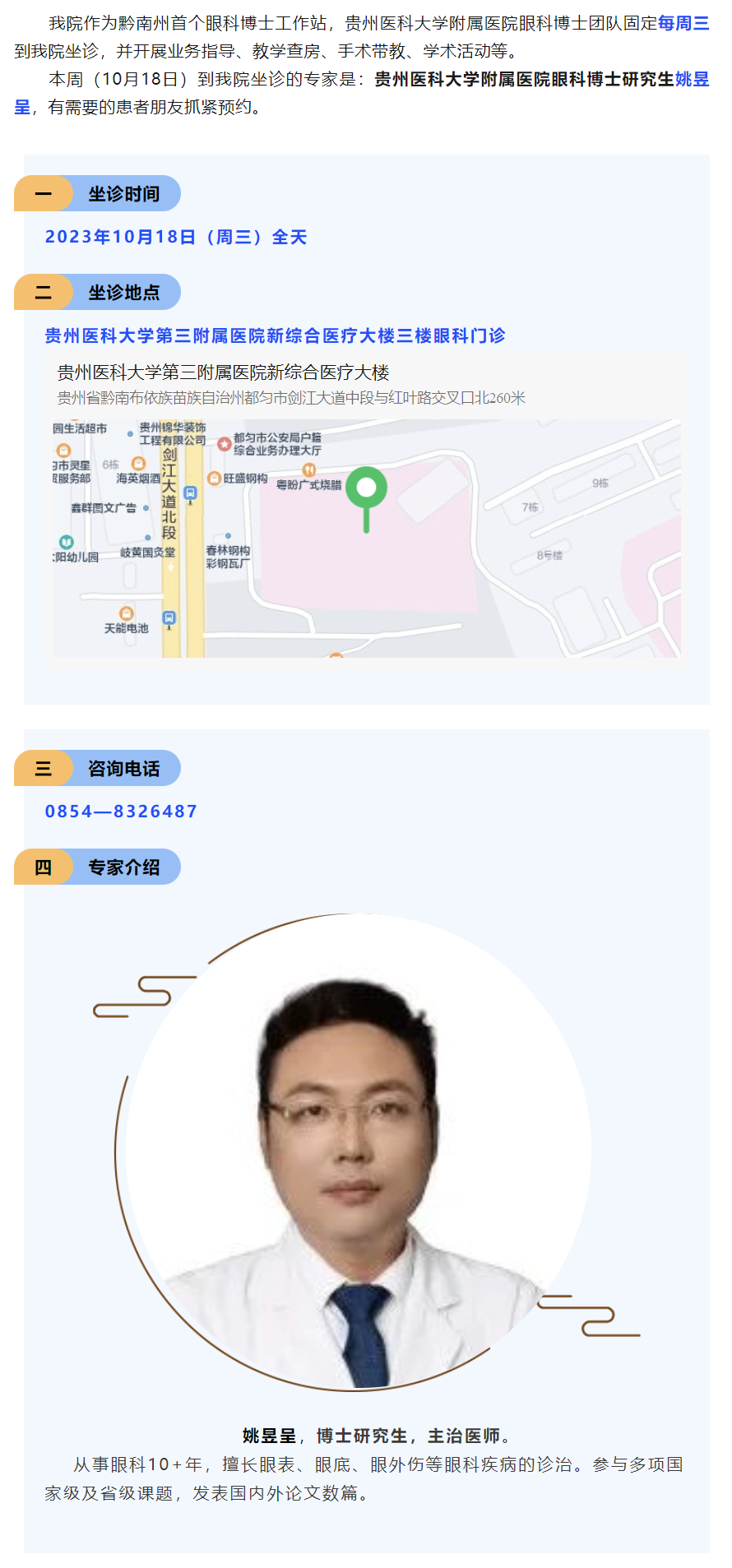 【贵医专家在都匀】10月18日眼科博士姚昱呈来我院坐诊!速约~