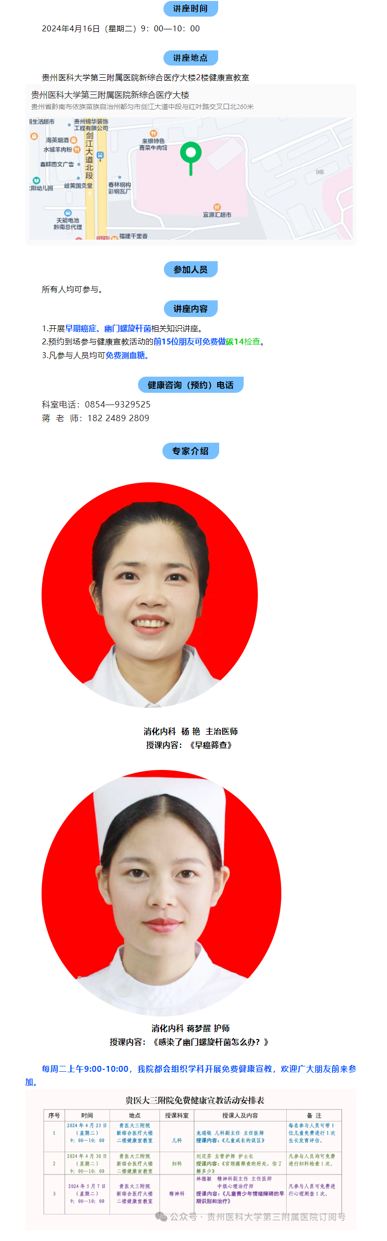 消化内科精心准备了一场免费健康知识讲座,预约到场参与健康宣教活动的前15位朋友可免费做碳14检查,凡参与人员均可免费测血糖。欢迎广大朋友前来参加。