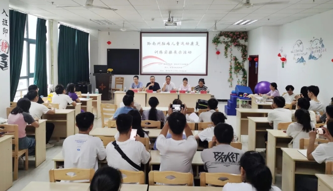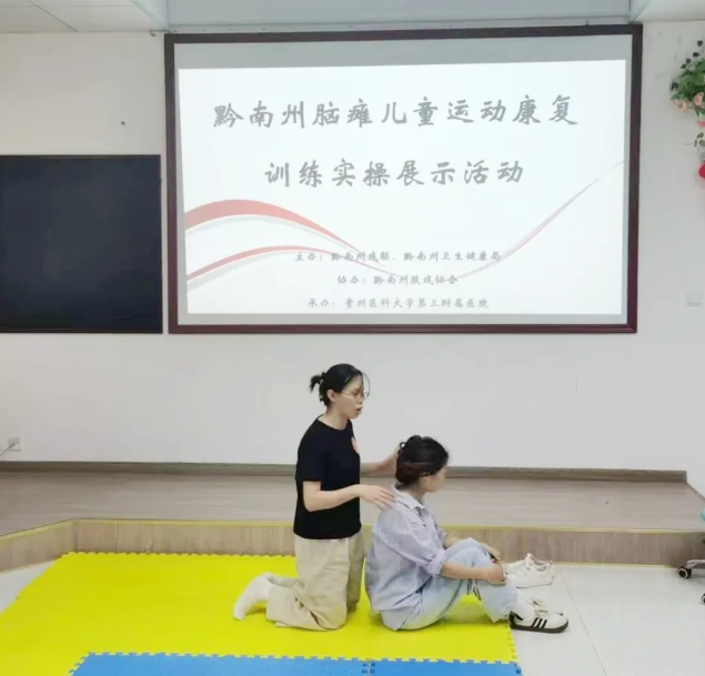 近日,黔南州脑瘫儿童运动康复训练实操展示活动在我院成功举办,黔南州残疾人联合会党组成员、副理事长王进出席,黔南州18名治疗师、我院相关科室参加。