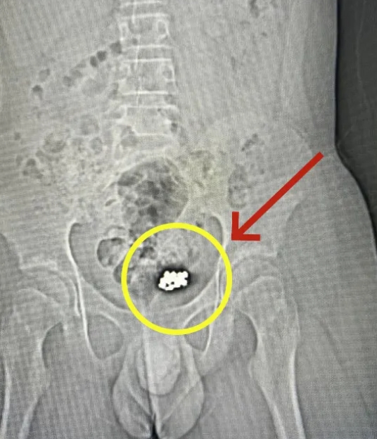 近日,贵医大三附院泌尿外科接诊了一位13岁的男孩小林。原来1年前,他在好奇心的驱使下,把16枚磁力钢珠塞进了自己的尿道。这导致他最近出现了眼睑浮肿、尿频、尿急、排尿中断等症状,于是到我院泌尿外科就诊。