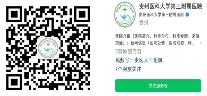 第一步:扫码或微信搜索“贵州医科大学第三附属医院”关注微信公众号。