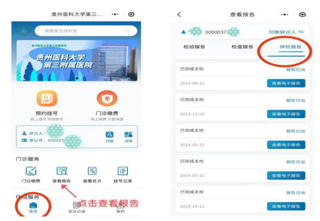 体检完成后3—10个工作日,登陆“贵州医科大学第三附属医院微信公众号”就可查看体检报告,还可下载电子版。操作流程如下: