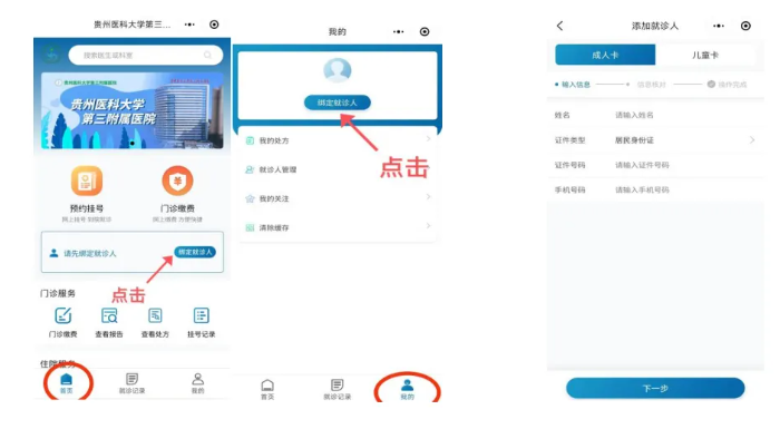 第三步:在“首页”或“我的”,绑定就诊人,按照系统提示输入身份证号等个人信息并保存。温馨提示:身份证号一定要准确,不然接收不到体检报告哦。