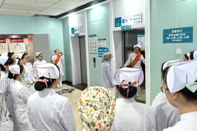 在轮椅转运及电梯礼仪的培训中,通过角色扮演的方式,模拟与患者交流的场景,让大家更加深刻地体会到了有效沟通的重要性。