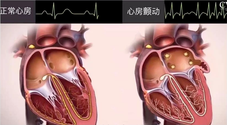 房颤是临床极为常见的心律失常。正常心跳是60-100次。房颤的时候,左心房跳动350-550次,频率太快了就是颤抖的状态,没有了收缩功能。有房颤的病人脑梗塞的可能增加5倍。