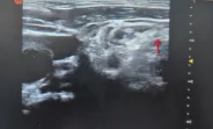红色箭头处为穿刺针显影(治疗神经根型颈椎病)