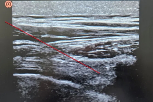图为超声引导下椎旁间隙注射,红线为穿刺路径