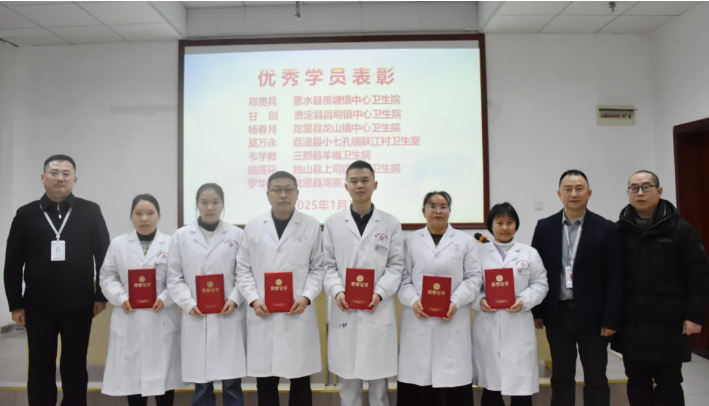优秀学员:独山县上司镇中心卫生院医生陆莲花(左二)、荔波县小七孔镇联江村卫生室医生莫万永(左三)、惠水县羡塘镇中心卫生院医生郑贵兵(左四)、贵定县昌明镇中心卫生院医生甘创(左五)、龙里县湾寨卫生院医生罗华芬(左六)、龙里县龙山镇中心卫生院医生杨春月(左七)