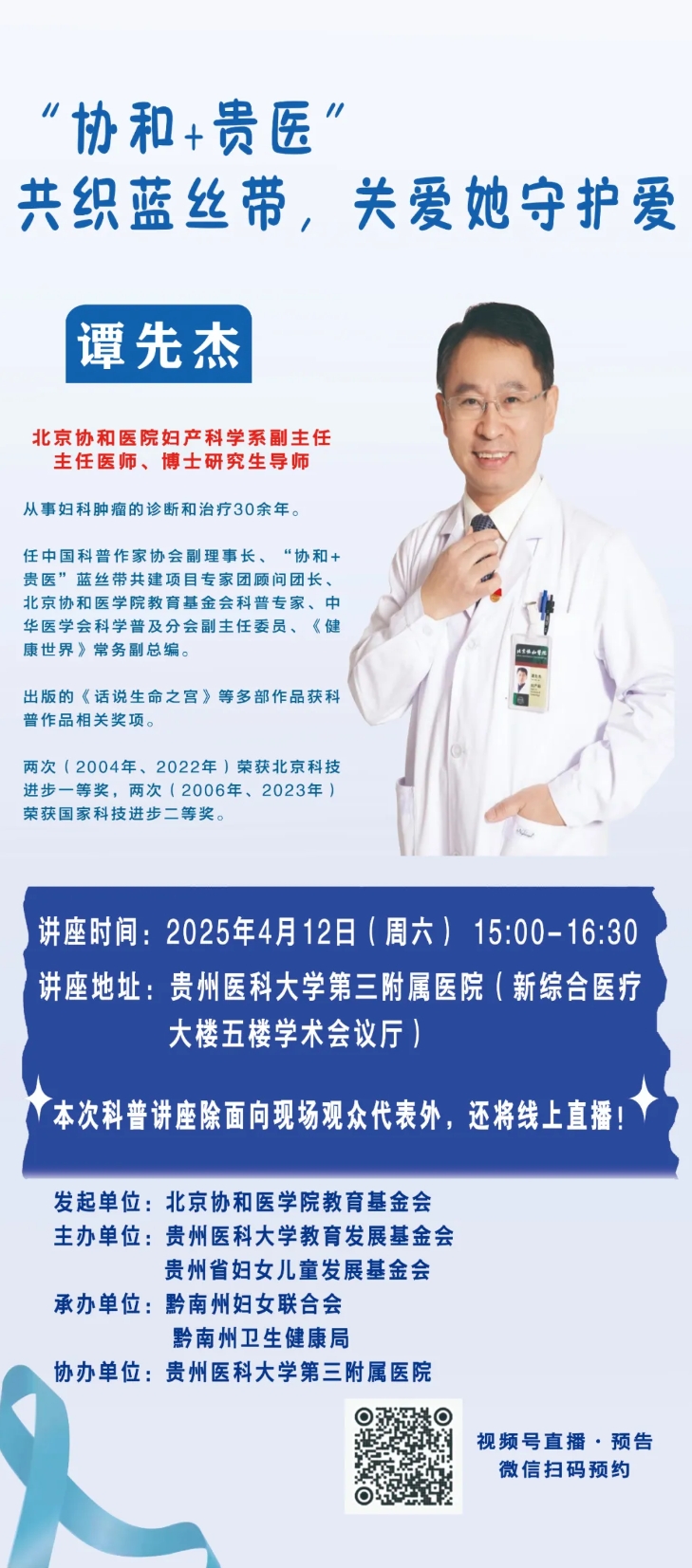 2025年4月12日(周六)15:00-16:30,谭先杰教授将采取“线下讲座+线上直播”方式,在黔南州都匀市贵州医科大学第三附属医院(新综合医疗大楼五楼学术会议厅)开展宫颈癌防治方面的公益讲座。讲座结束后,免费为50人次提供宫颈癌筛查!