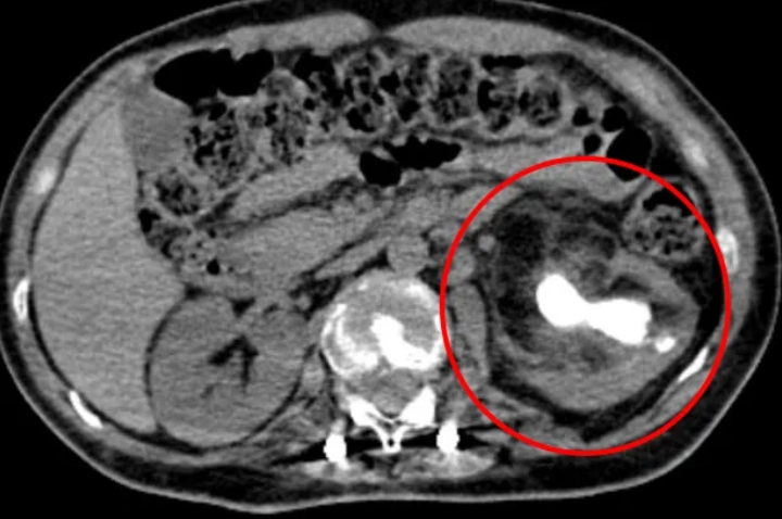腹部CT检查显示,其左侧肾盂存在巨大结石,且伴有左侧肾盂积水和感染。若不及时处理,肾功能将面临进一步损害的风险。