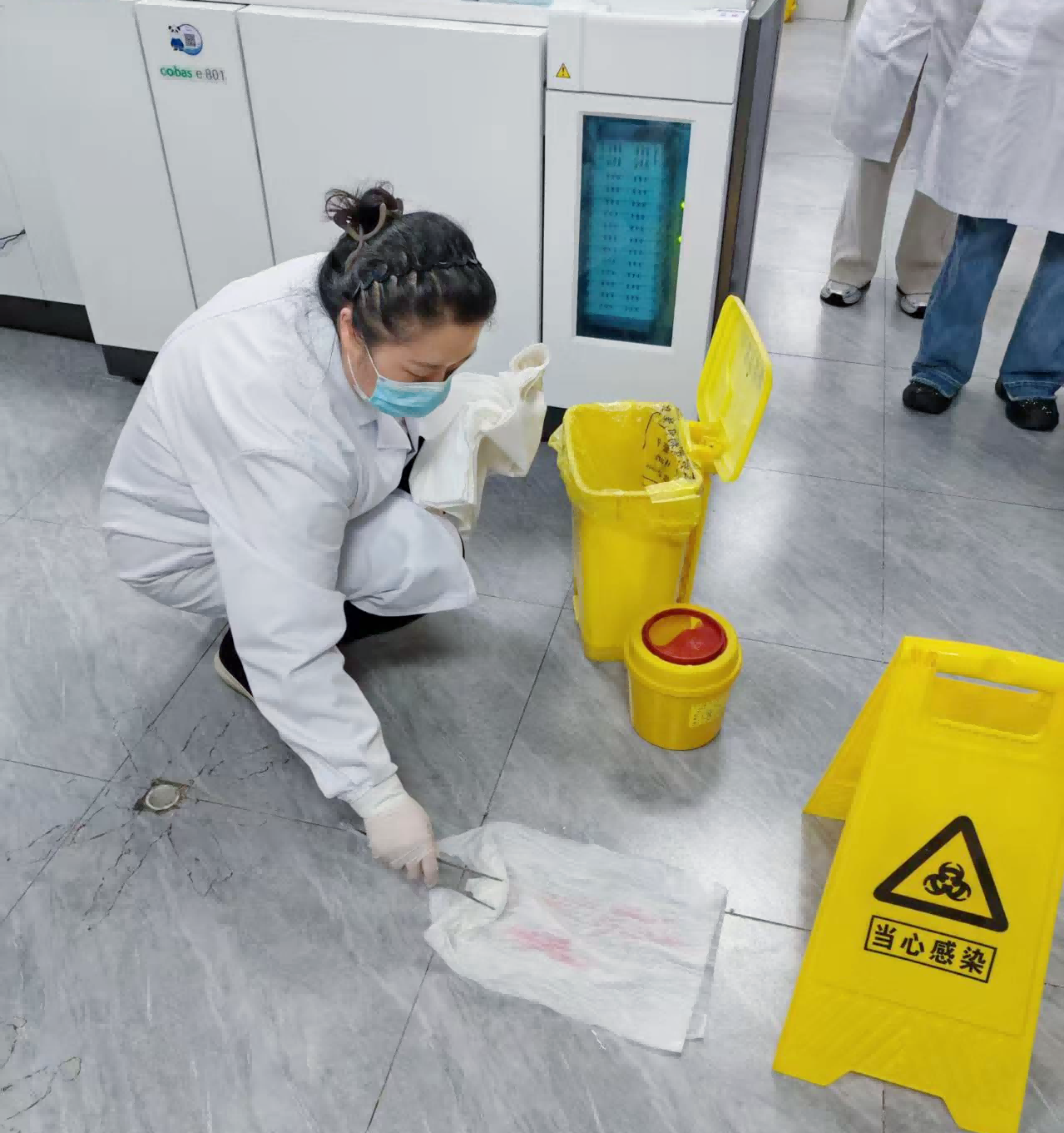 演练模拟标本意外溢洒场景。事发后,检验工作人员立即上报科室负责人,启动应急预案,设置警示标识与隔离区,防止污染扩散,按“吸附 — 消毒 — 清理”流程处置污染区域,医疗废物按照有关规范密闭处理。