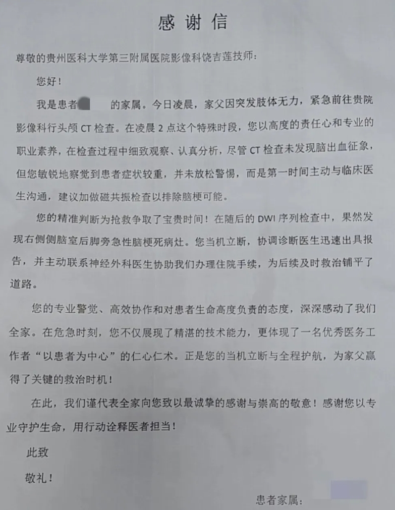 近日,我院影像科技师饶吉莲收到患者王先生(化名)家属的感谢信,信中讲述了她在凌晨成功识别脑梗,为患者争取黄金救治时间的经过。 凌晨,王先生因突发肢体无力到我院影像科做头颅CT检查。饶吉莲完成检查后,CT虽未显示脑出血,但凭借丰富的临床经验,察觉到患者病情严重,立即联系临床医生讲述王先生的病情,并做磁共振(MRI)排除急性脑梗死。 MRI检查后确认王先生右侧枕、顶叶及部分岛叶旁存在急性脑梗死病灶。 饶吉莲迅速协调诊断医生出具报告,并协助家属办理住院手续,为后续紧急溶栓治疗争取了时间。 家属在感谢信中由衷感谢饶吉莲,称她的专业素养与高度责任心让他们深受触动。这封信,既是对饶吉莲的肯定,也映照出我院医务工作者恪守“人民至上、生命至上”这一理念的日常点滴。